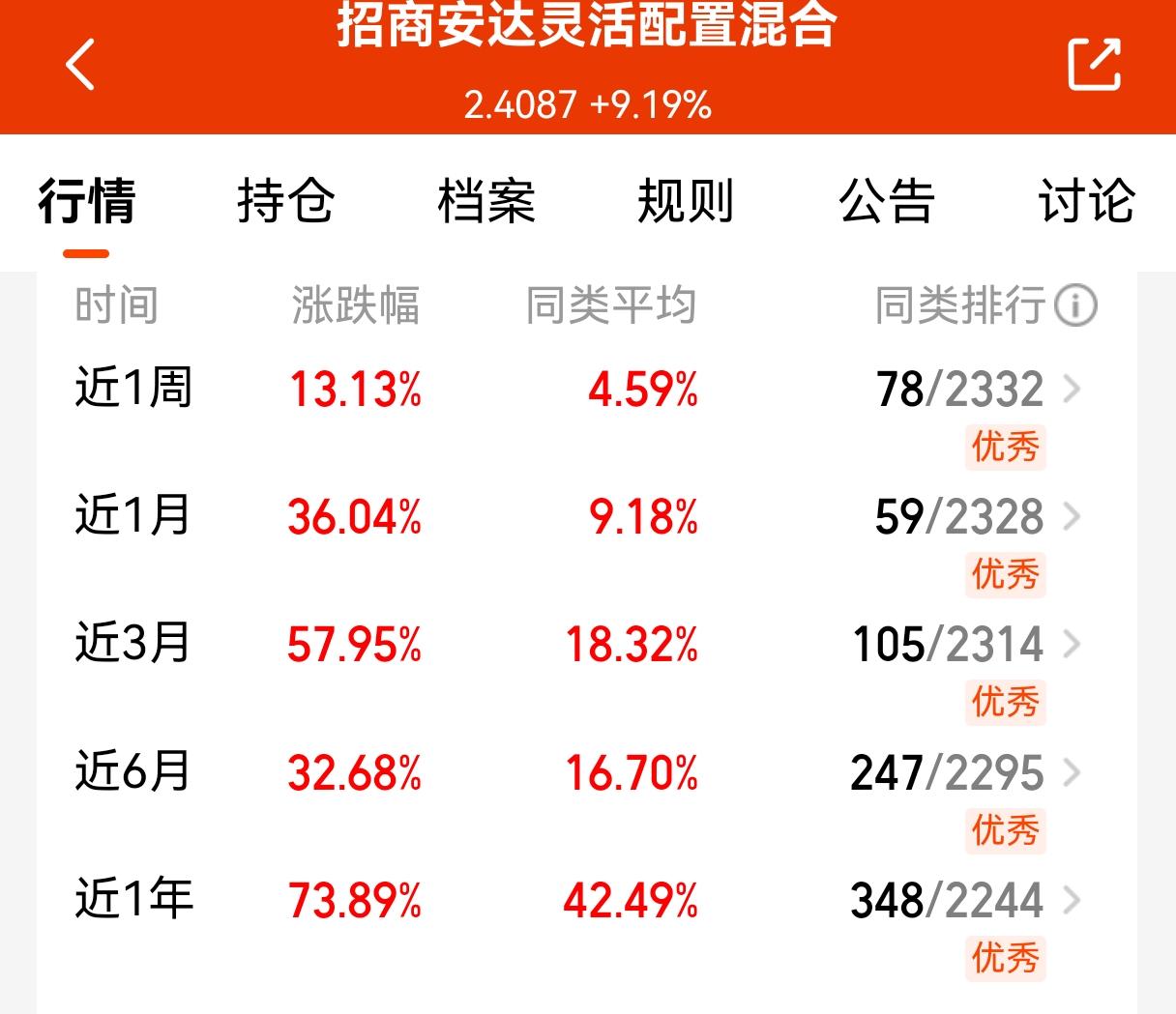 今年科技还是很牛的,昨天大涨,今日有所波动,可以适当加仓起来,$招商安达灵活配置混合(OTCFUND|217020)$昨天大涨9.19%,近一周涨幅13.13%,近一个月涨幅36.04%,近三个月涨幅57.95%,近一年涨幅73.89%,业绩很优秀,这是一只小众CPO宝藏基,持仓里面的新易盛、沪电股份、中际旭创等近期涨嗨了,经理眼光很好,调整提前埋伏CPO,抓住了这一波行情。