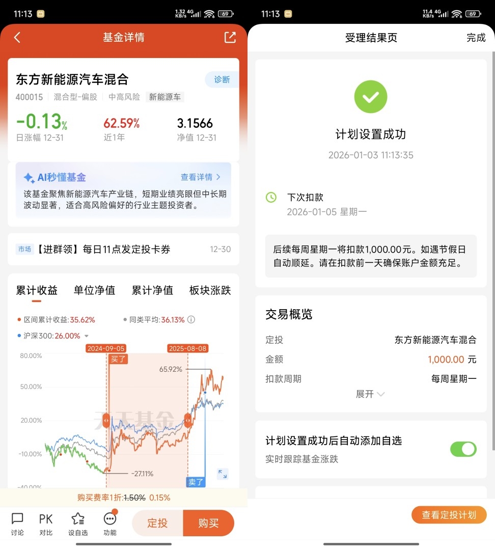 作为23届刚转正的职场新人,租房+通勤+日常开销后,工资卡余额总是“捉襟见肘”。但从2024年3月第一次跟风买基金开始,我竟靠着东方新能源汽车混合(400015)赚出了大半年房租——24年3月实习工资凑的5000元打底,7月、9月咬牙加仓到2万,25年10月卖出时净赚75%!如今工作稳定,我果断敲定2026年“躺平投资方案”:每周定投1000元,长期持有这只“老伙计”,不追热点、不盯盘,让时间和赛道帮我赚钱~