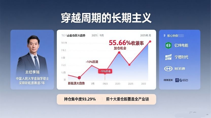 再看硬核数据,这只基金的持仓太对我的胃口了。2025年三季报显示,前十大重仓股包括亿纬锂能、宁德时代、比亚迪这些龙头,覆盖了电池、整车、零部件全产业链 。基金经理李瑞更靠谱,在中国人民大学金融学硕士毕业,在东方基金干了13年,深耕新能源汽车赛道7年多,换手率远低于同类基金,不是那种追涨杀跌的“短线选手”,而是真正陪着行业成长的长期主义者 。虽然他管理的基金在2022-2023年有过回撤,但2025年靠精准布局又涨了回来,这种“穿越周期”的能力,才是新手最需要的安全感。