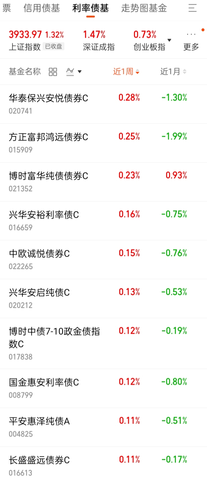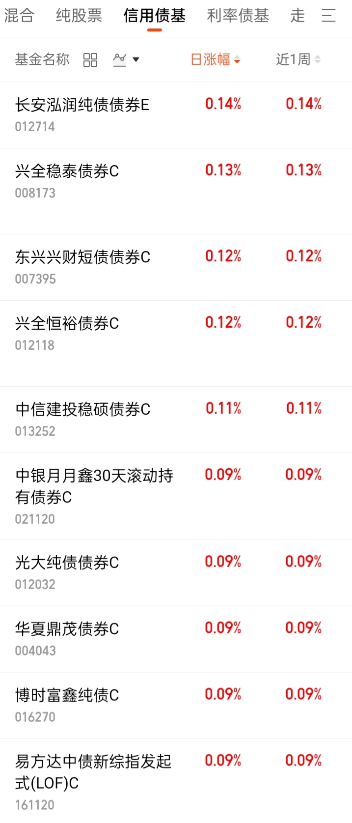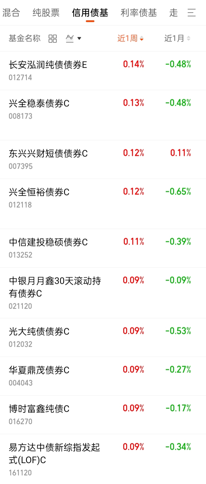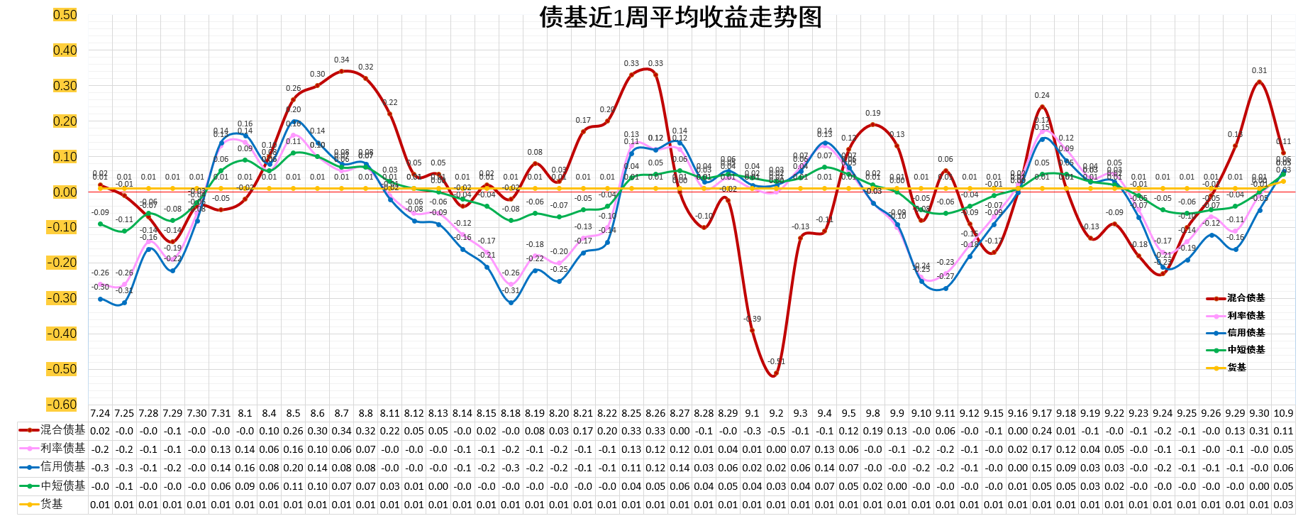 3、近1周平均收益排序:混合债基>信用债基>中短债基=利率债基>货基。
