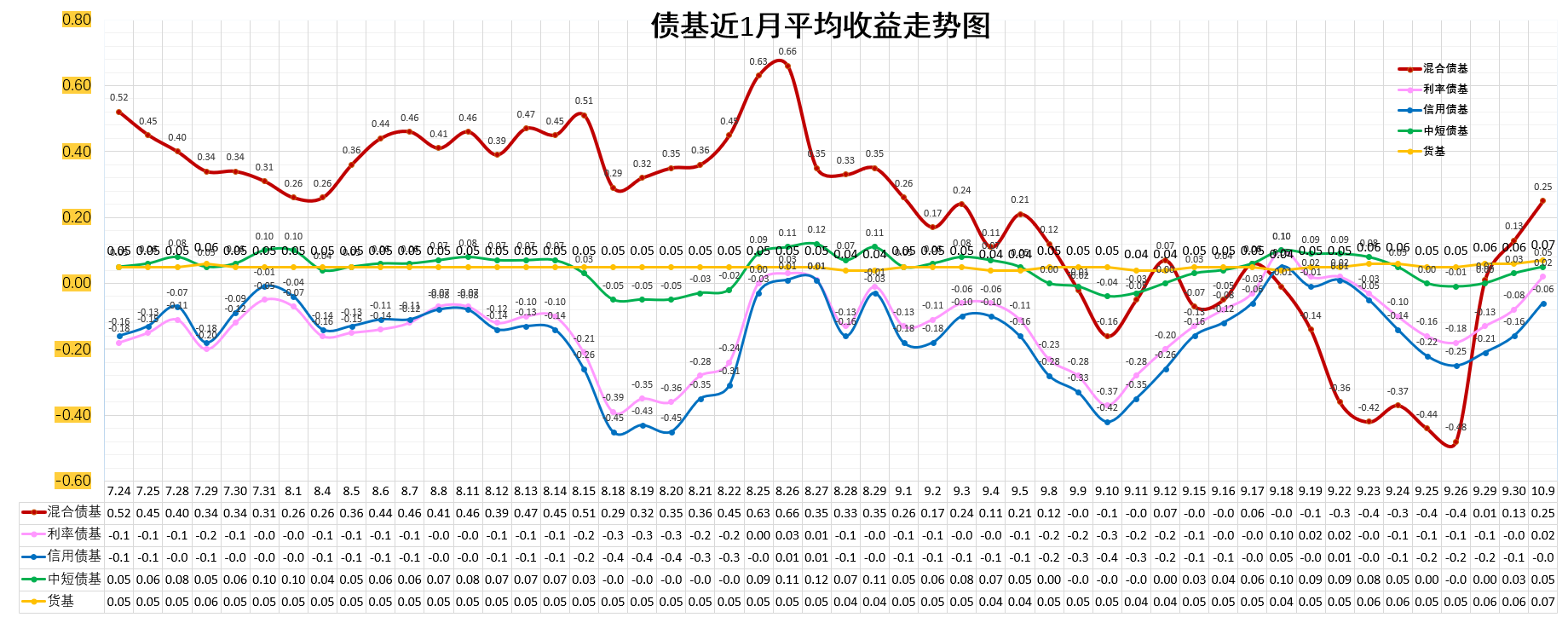 5、债基近1 周平均收益与前一天相比大幅上升。 债基近1 月平均收益与前一天相比大幅上升。混合债基近1周平均收益与前一天相比大幅下降。