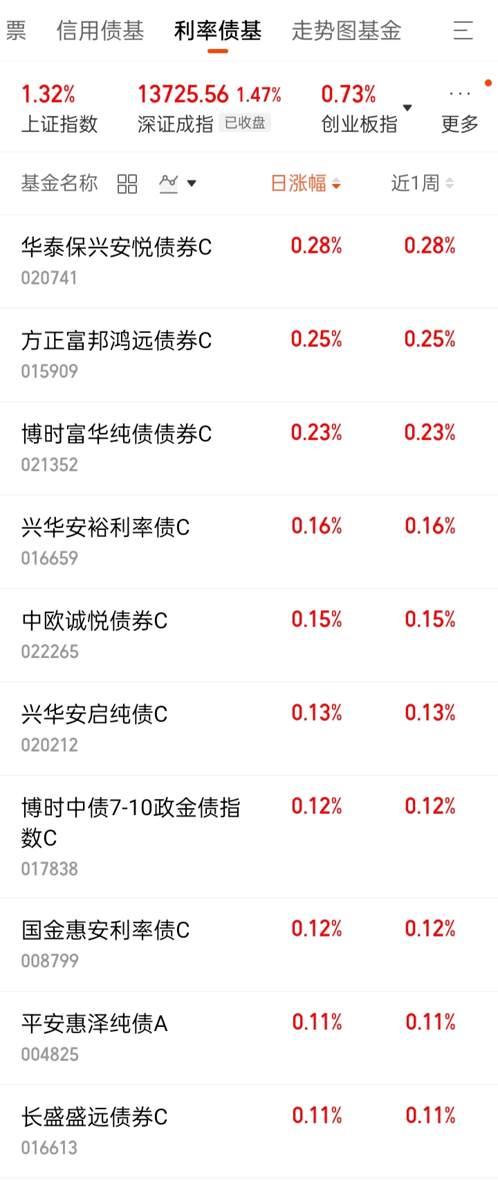 $南方中债7-10年国开行债券指数E(OTCFUND|013594)$。$华泰保兴安悦债券C(OTCFUND|020741)$。$华泰保兴安悦债券A(OTCFUND|007540)$。$鹏华丰禄债券(OTCFUND|003547)$。$方正富邦鸿远债券C(OTCFUND|015909)$。$永赢稳健增强债券C(OTCFUND|014089)$。$国泰惠丰纯债债券A(OTCFUND|007214)$ 。$富国优化增强债券E(OTCFUND|018980)$。$易方达增强回报债券A(OTCFUND|110017)$。$南方中债7-10年国开行债券指数A(OTCFUND|006961)$