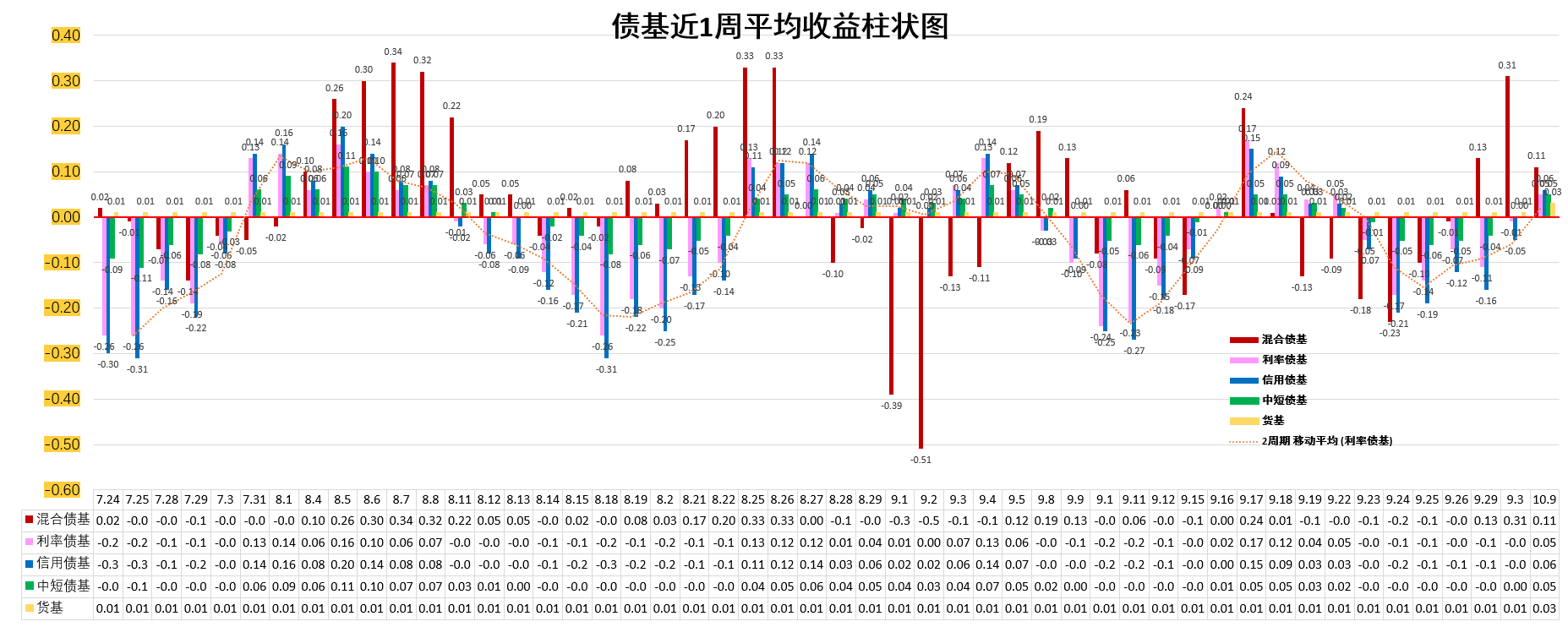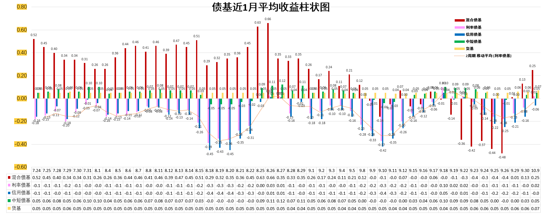 2、混合债基近1周平均收益高于货基,高于债基。利率债基近1周平均收益低于信用债基。