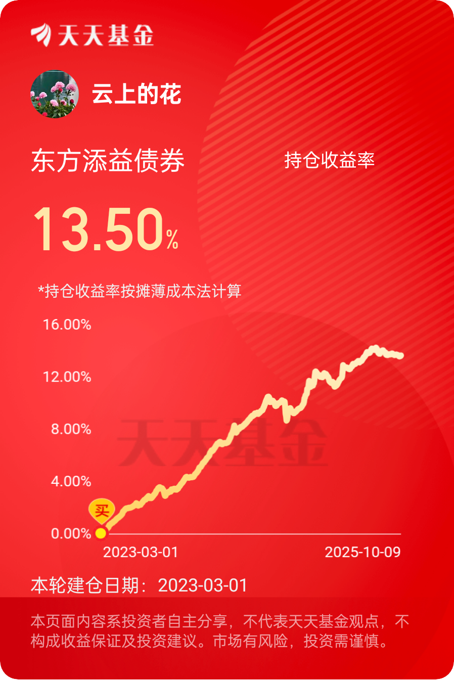 今天又是一个下雨天,利率债回落明显,还在飞流直下三千尺;信用债目前还好,能有蛋收!就是不知道能不能稳住了,如今的局面盼翻红的希望比较渺茫了,只能祈祷少碎蛋!$东方添益债券$ #晒收益#