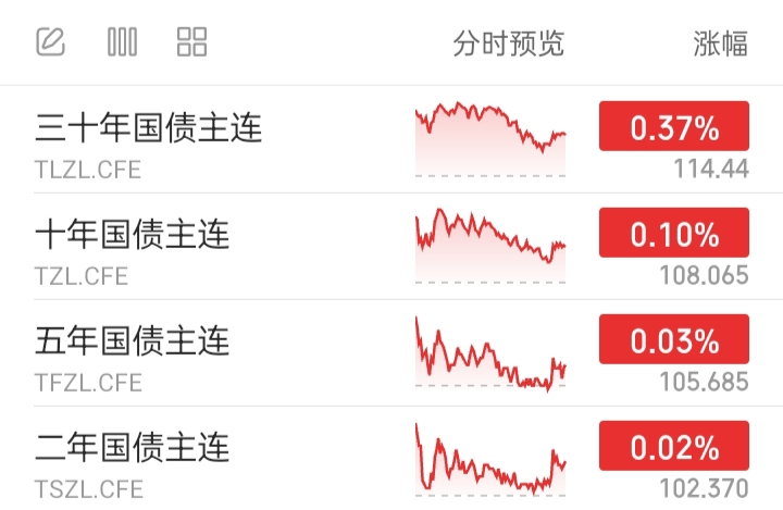 今天5、10年国债期货日K线收盘后在5、10、20日均线之上,2、30年国债期货日K线收盘后在5日均线之上,整体高开后小幅震荡下行,走势较弱。