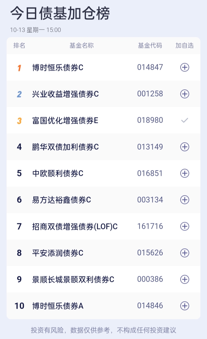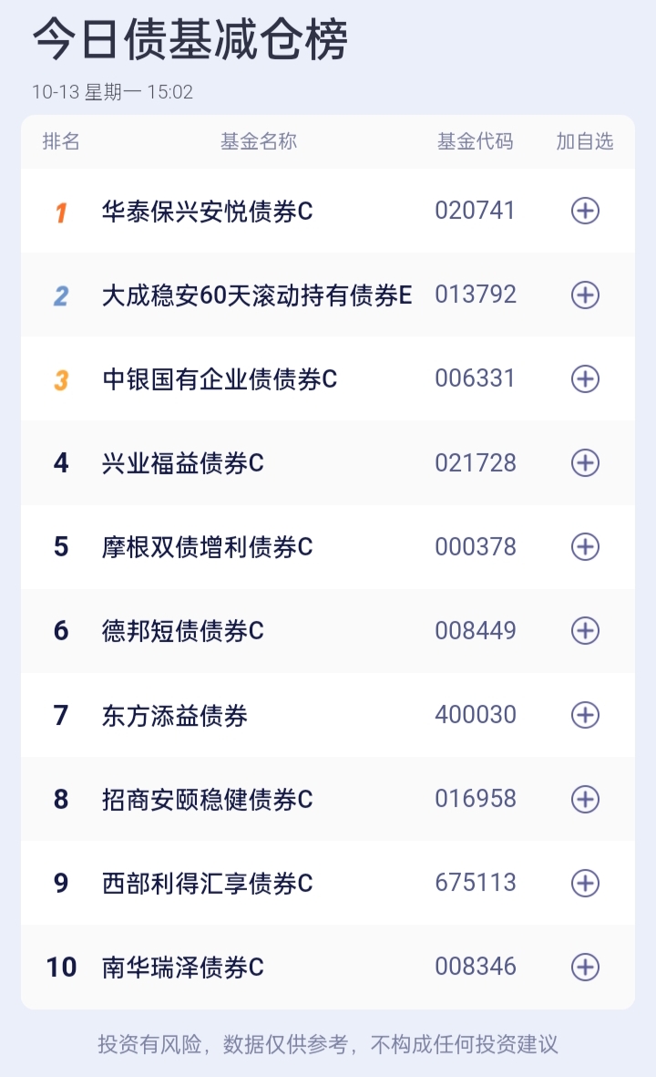 八、债券基金加、减仓榜(截止到15:00收盘)