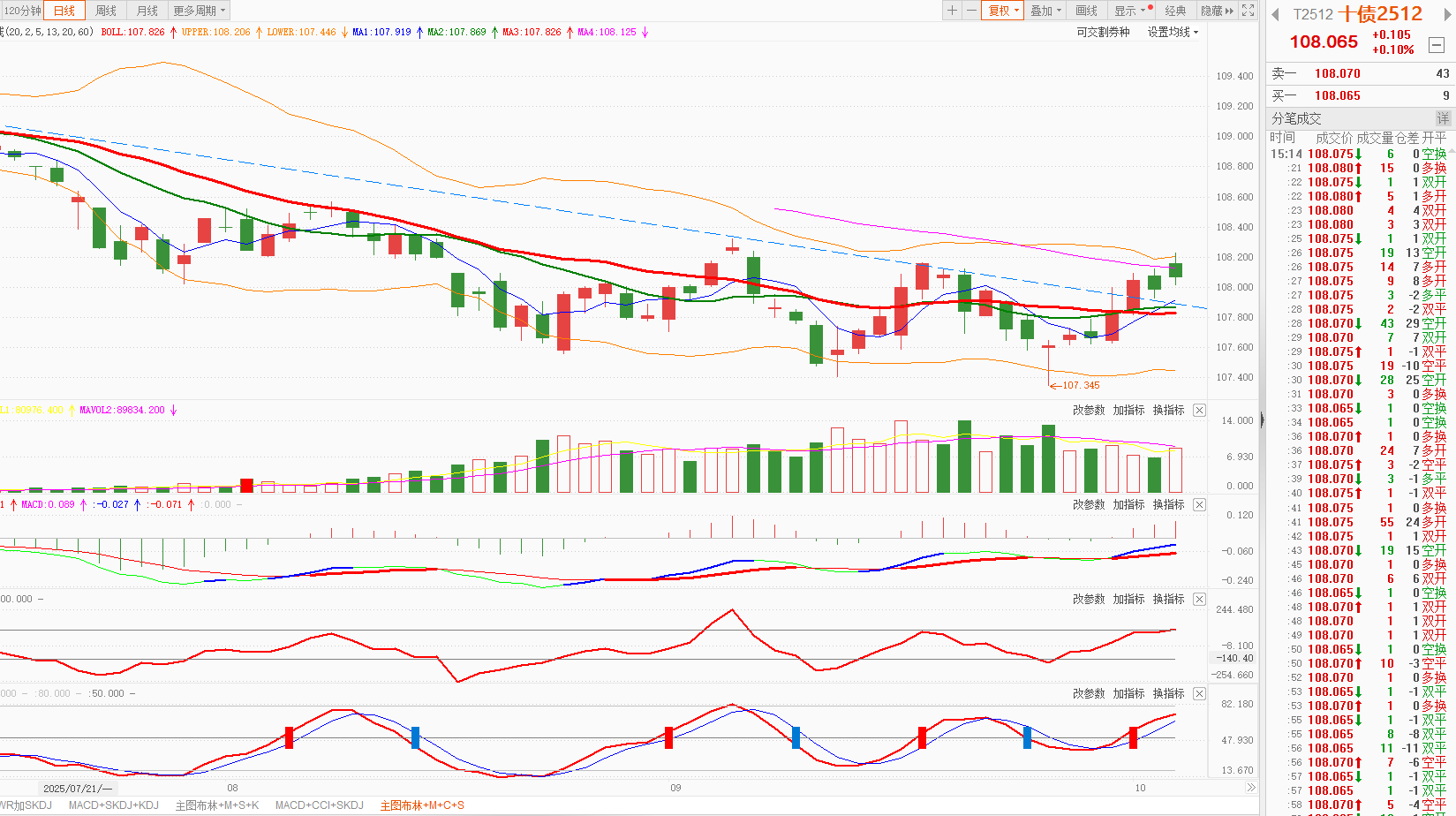 今天10年国债期货在周六债券二级市场大涨的情况下,今天补涨,大幅高开后小幅震荡下行,总体涨0.10%,日K线在5、10、20日均线之上。