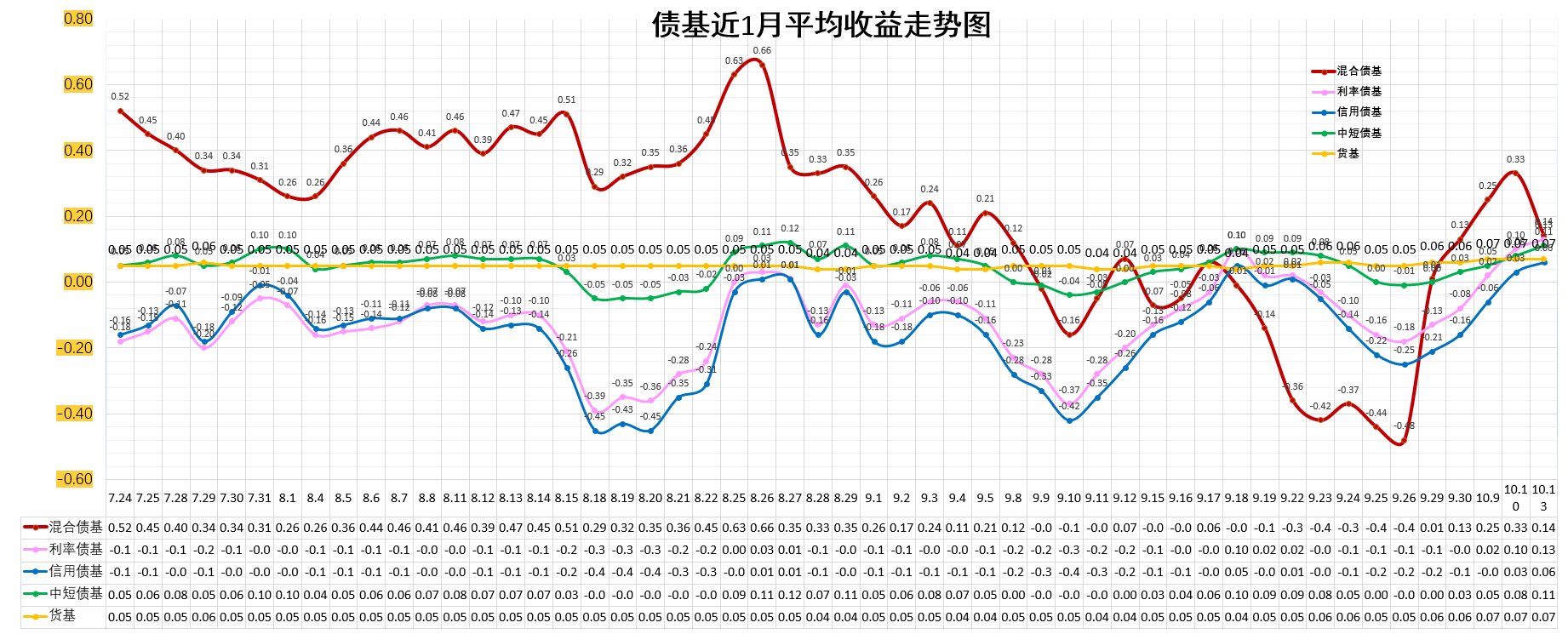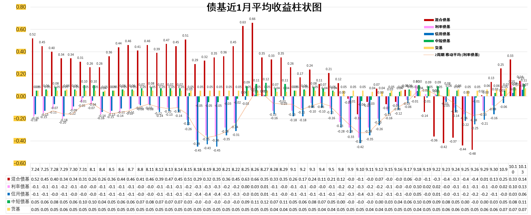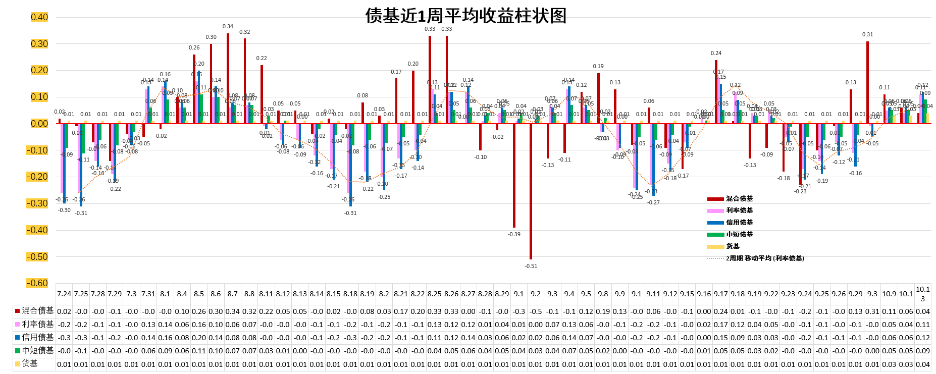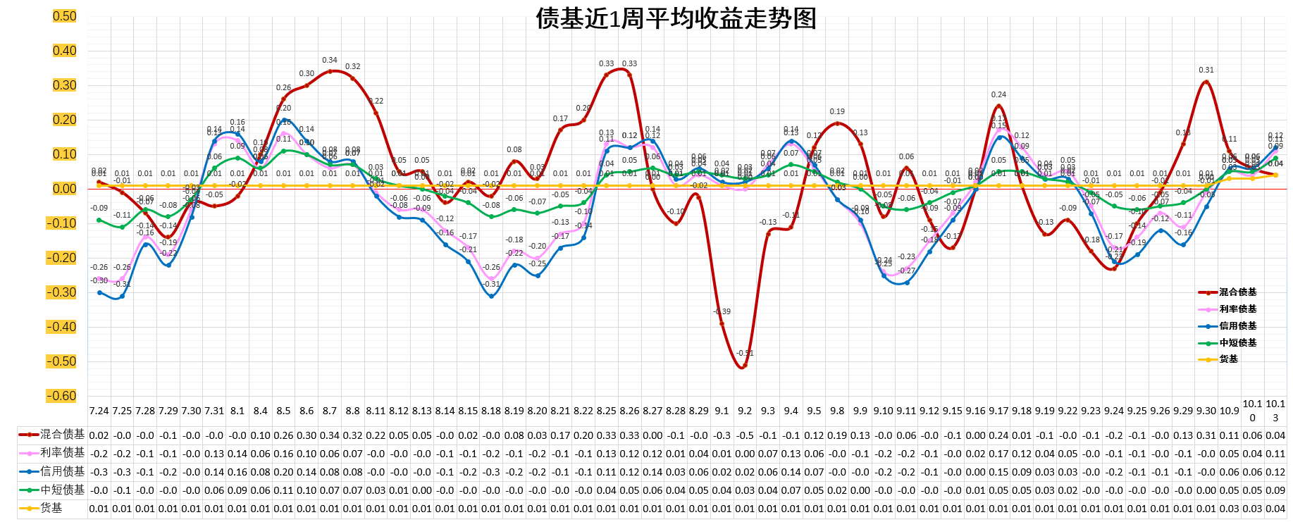 3、近1周平均收益排序:信用债基>利率债基>中短债基>货基>混合债基。