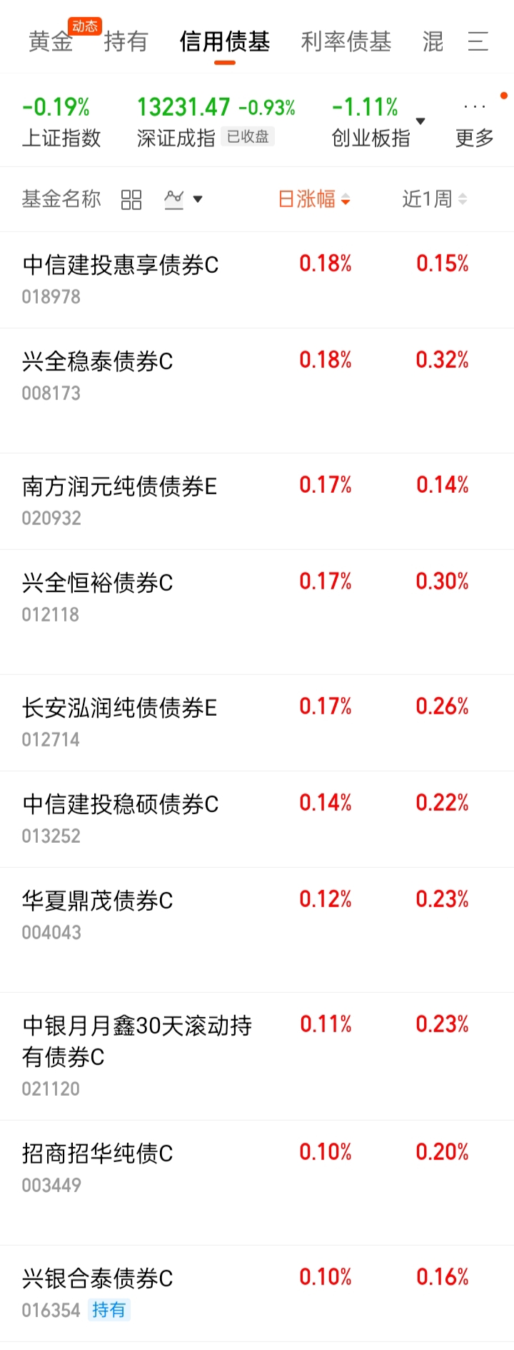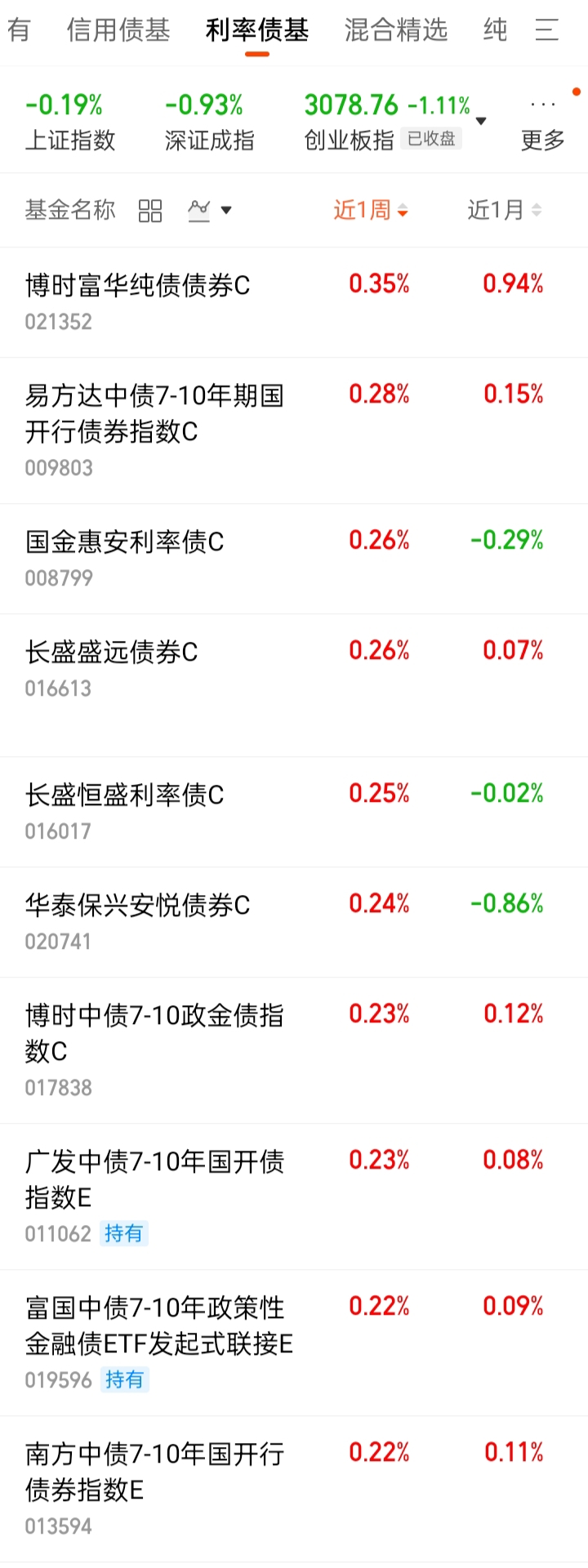 $南方中债7-10年国开行债券指数E(OTCFUND|013594)$。$华泰保兴安悦债券C(OTCFUND|020741)$。$华泰保兴安悦债券A(OTCFUND|007540)$。$鹏华丰禄债券(OTCFUND|003547)$。$方正富邦鸿远债券C(OTCFUND|015909)$。$永赢稳健增强债券C(OTCFUND|014089)$。$国泰惠丰纯债债券A(OTCFUND|007214)$ 。$富国优化增强债券E(OTCFUND|018980)$。$易方达增强回报债券A(OTCFUND|110017)$。$南方中债7-10年国开行债券指数A(OTCFUND|006961)$