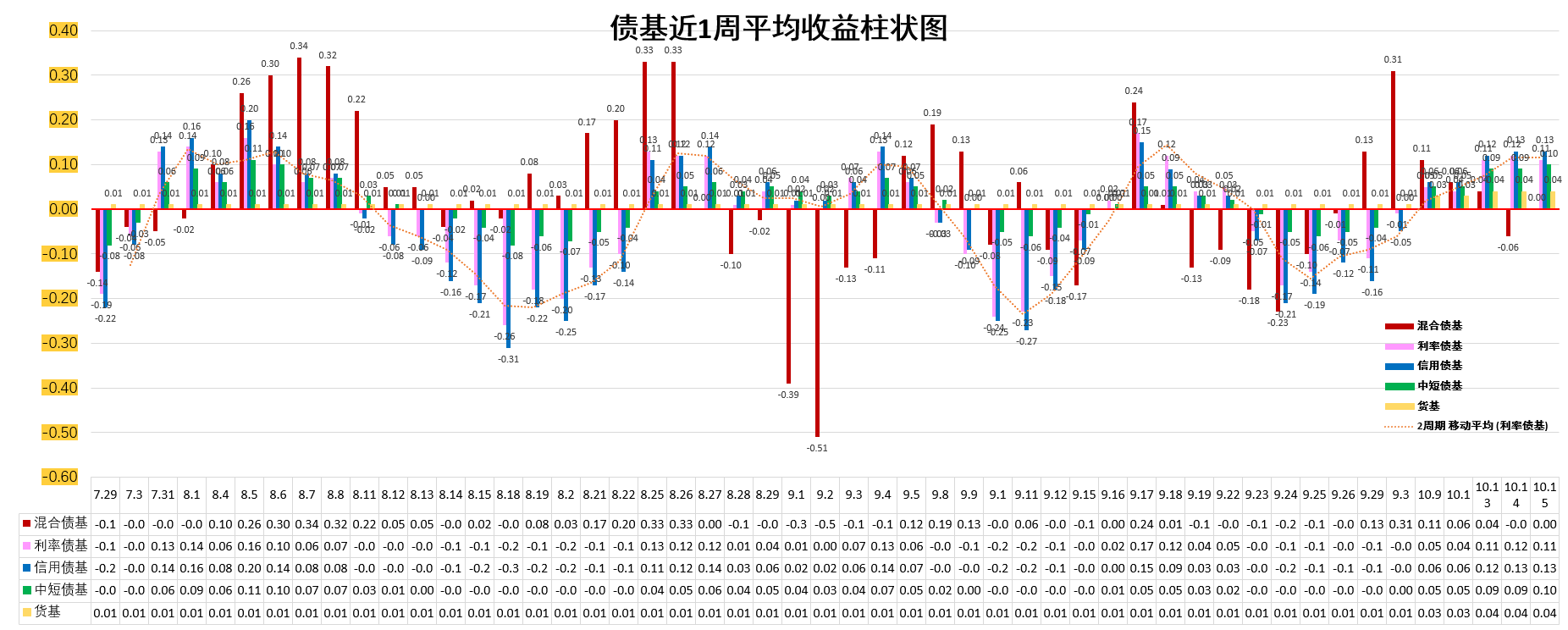 3、近1周平均收益排序:信用债基>利率债基>中短债基>货基>混合债基。