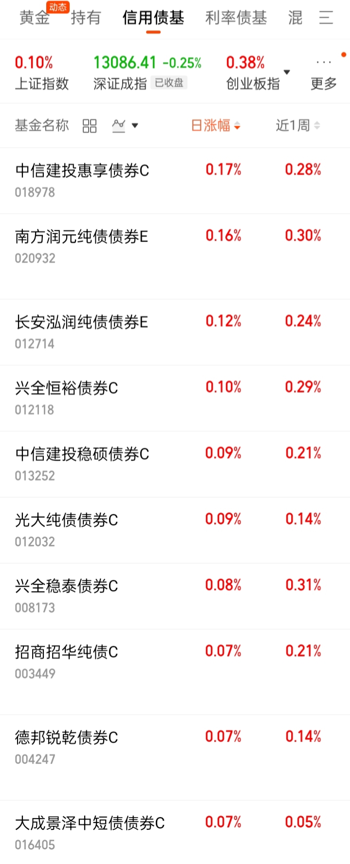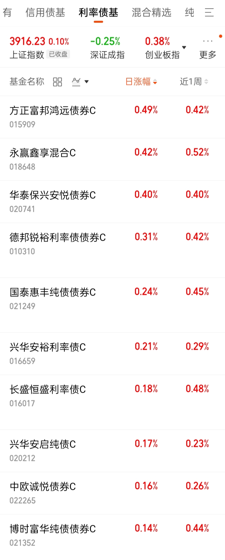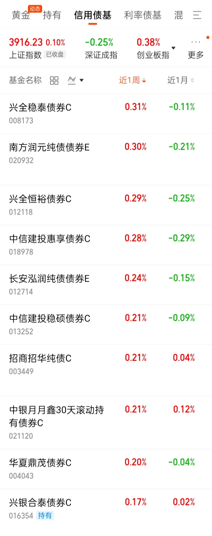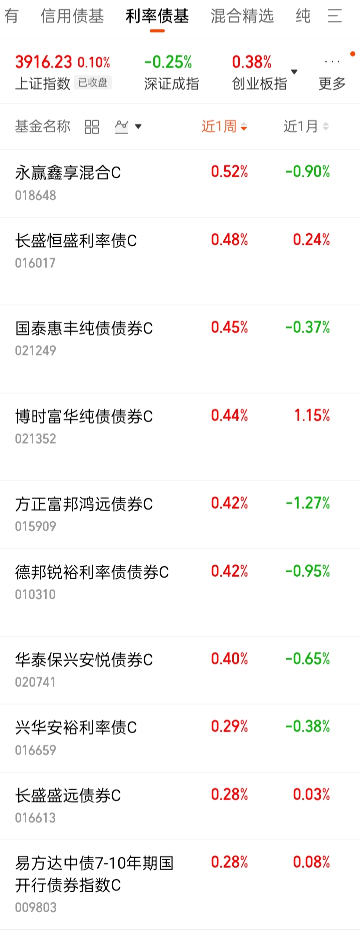 $华泰保兴安悦债券C(OTCFUND|020741)$。$南方中债7-10年国开行债券指数E(OTCFUND|013594)$。$华泰保兴安悦债券A(OTCFUND|007540)$。$鹏华丰禄债券(OTCFUND|003547)$。$方正富邦鸿远债券C(OTCFUND|015909)$。$永赢稳健增强债券C(OTCFUND|014089)$。$国泰惠丰纯债债券A(OTCFUND|007214)$。$博时恒乐债券C(OTCFUND|014847)$。$易方达增强回报债券A(OTCFUND|110017)$。$南方中债7-10年国开行债券指数A(OTCFUND|006961)$