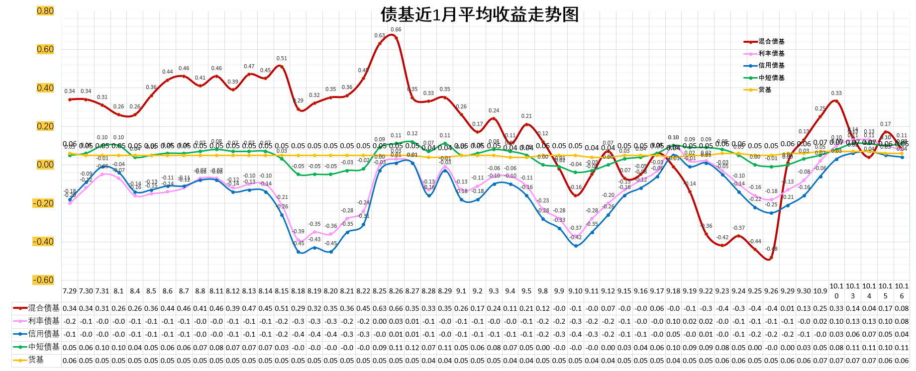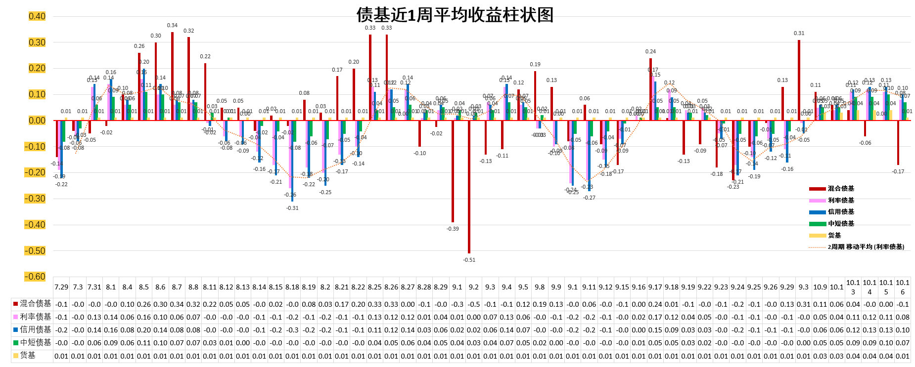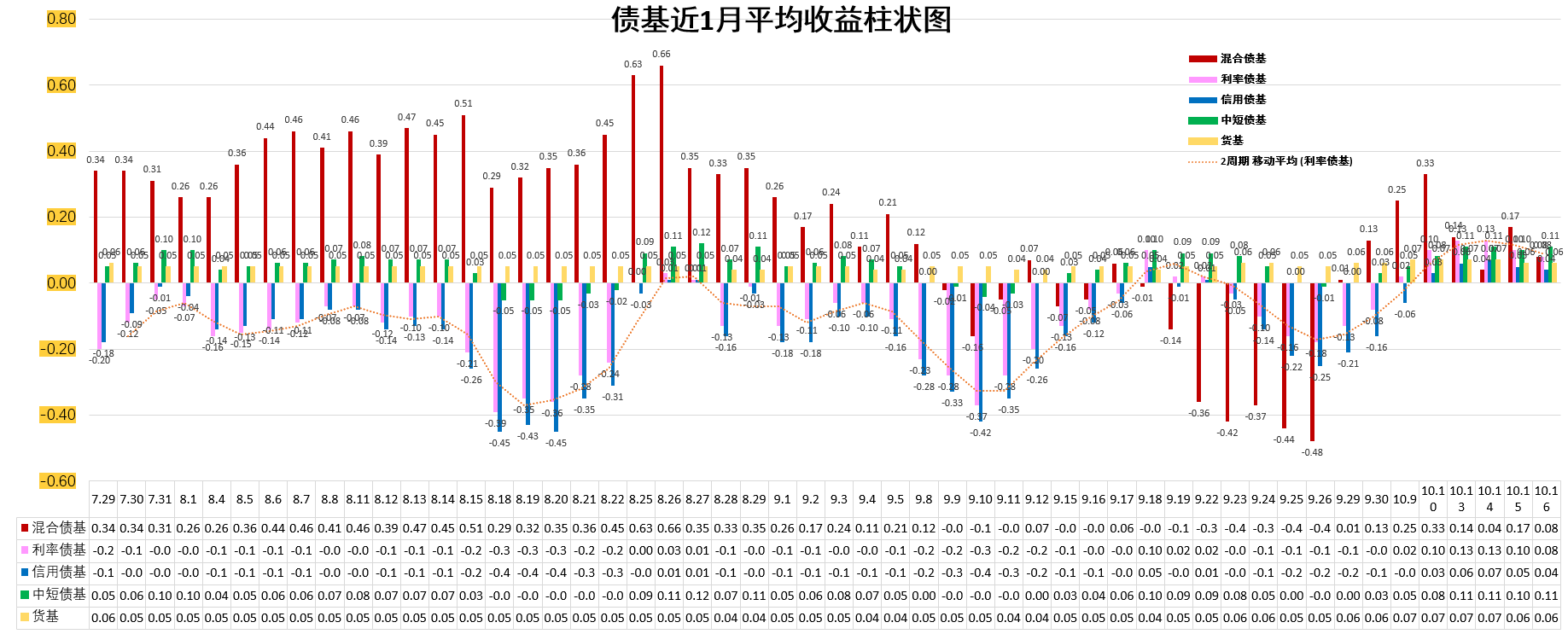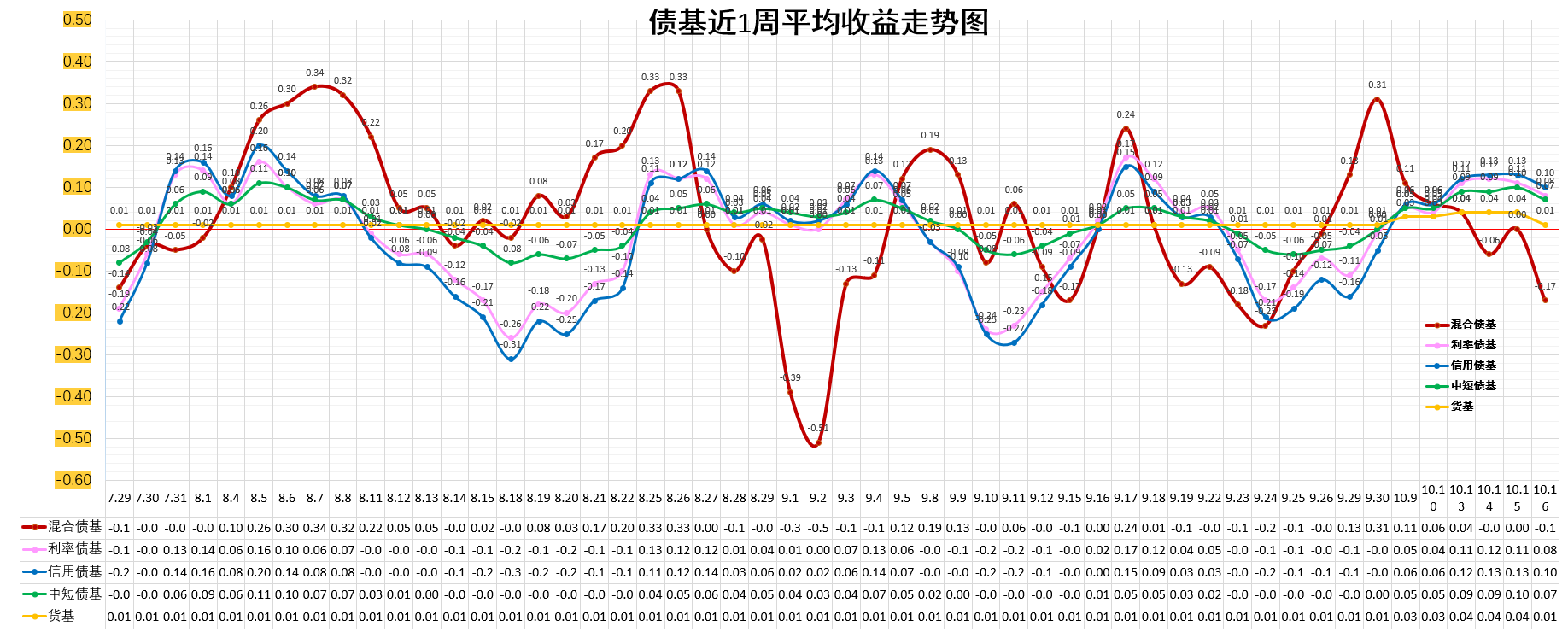 3、近1周平均收益排序:信用债基>利率债基>中短债基>货基>混合债基。