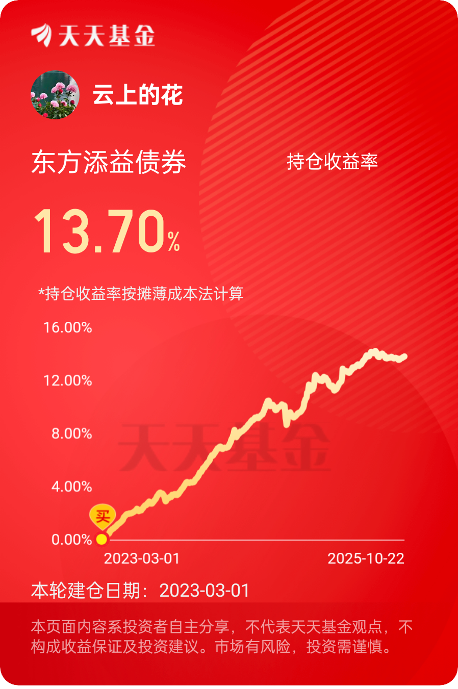 10月23日午盘。大盘这边回升了些,不过利率债目前持仓还都是小晴天的,希望稳住到收盘吧,信用债总体维持稳健。依然可以收蛋$东方添益债券$ #晒收益#