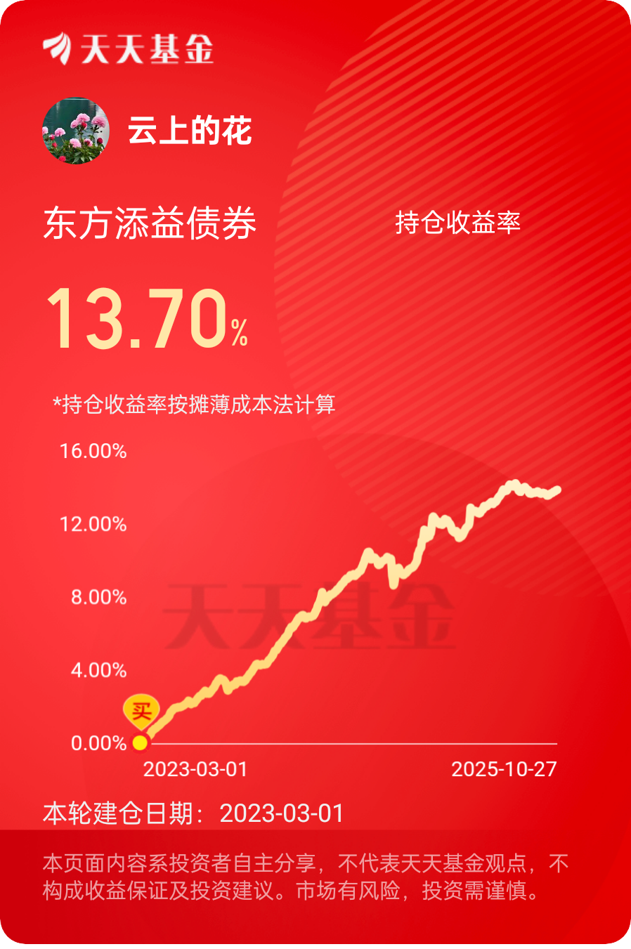 债市的表现还是不错的,基本维持上涨,权益方向的数据也是很好,债市不断在拉升,希望收盘能来个股债双丰收$东方添益债券$ #晒收益#