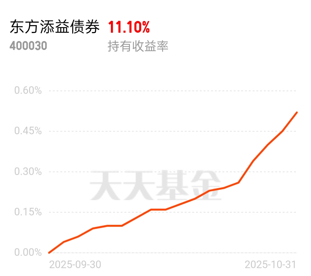 债市这边利率债雨天,信用债小晴天,目前跌幅不大,最近利率债上涨幅度较多,稍微回踩一下也是不错的。信用债表现比利率债更好一些。年底我还是比较更看好债券行情。$东方添益债券$