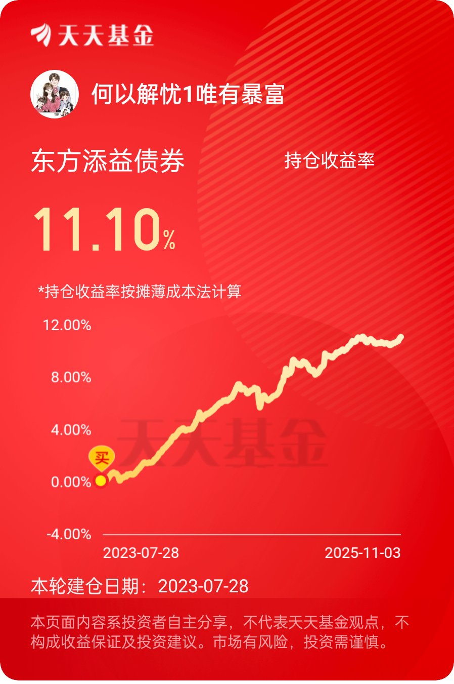 市场越是震荡不安,债基的“稳”就越能体现出来。你看最近债市回暖,之前的调整不仅慢慢回了本,还赚了不少,这种时候持有债基,心里踏实多了。$东方添益债券$ #晒收益#