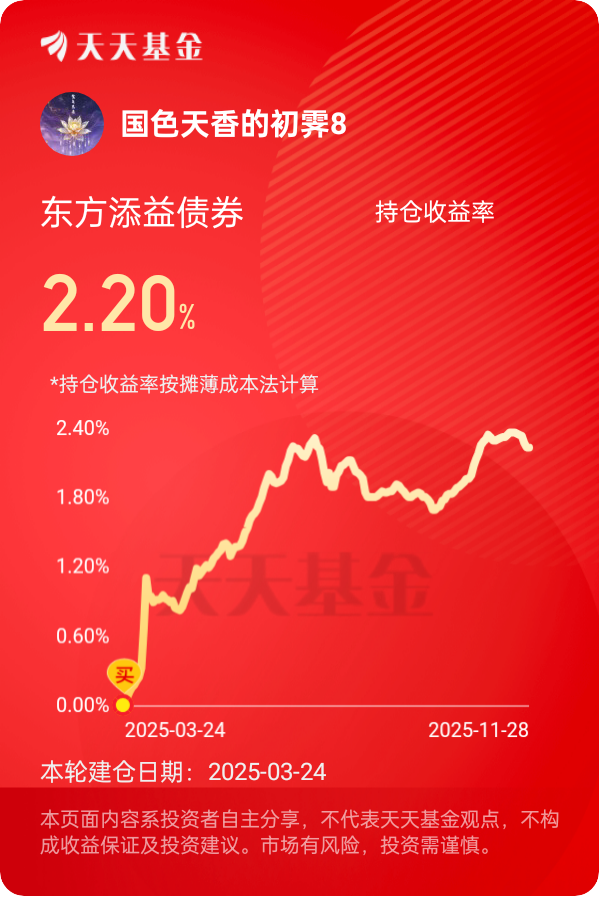 债市也来“上分”啦!利率债小幅飘红,信用债表现亮眼,哪怕整体涨跌参半,在经济弱现实+资金面支撑的背景下,债券的稳健配置价值依旧在线,是资产配置里安心的“压舱石”。$东方添益债券$ #晒收益#
