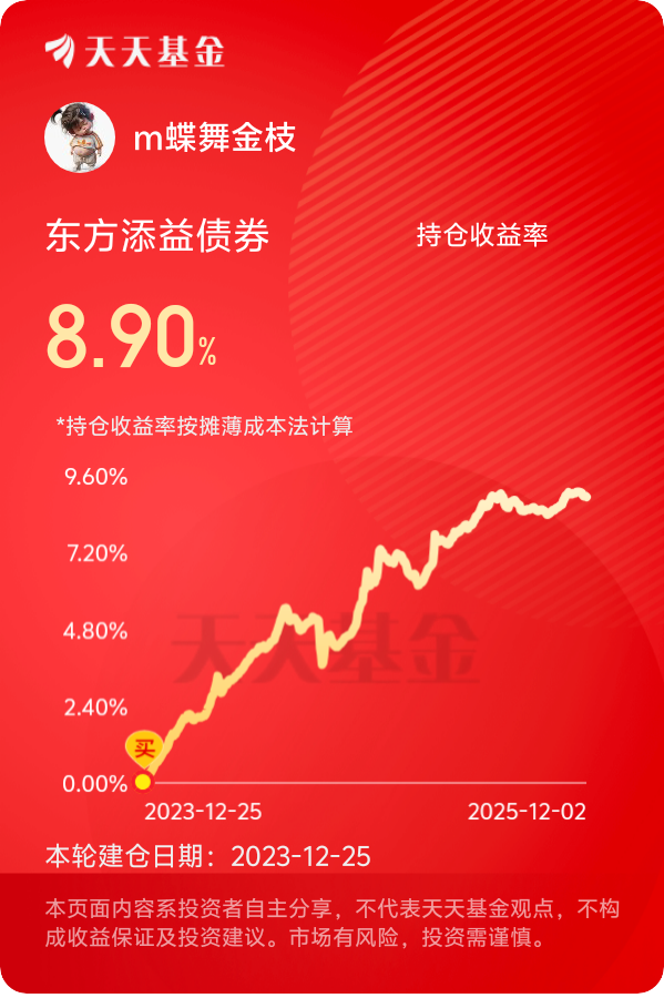 股市小波动不用慌,债市反而在稳步上行,这会儿低吸不追高,蹲个债基慢慢吃收益,持有的别慌,稳稳当当最实在。$东方添益债券$ #晒收益#