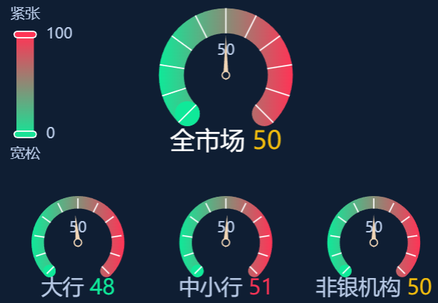 六、资金面情绪指数:全市场50 资金面紧平衡 (0-100紧张度递增,50为均衡,超过50反映资金紧张)