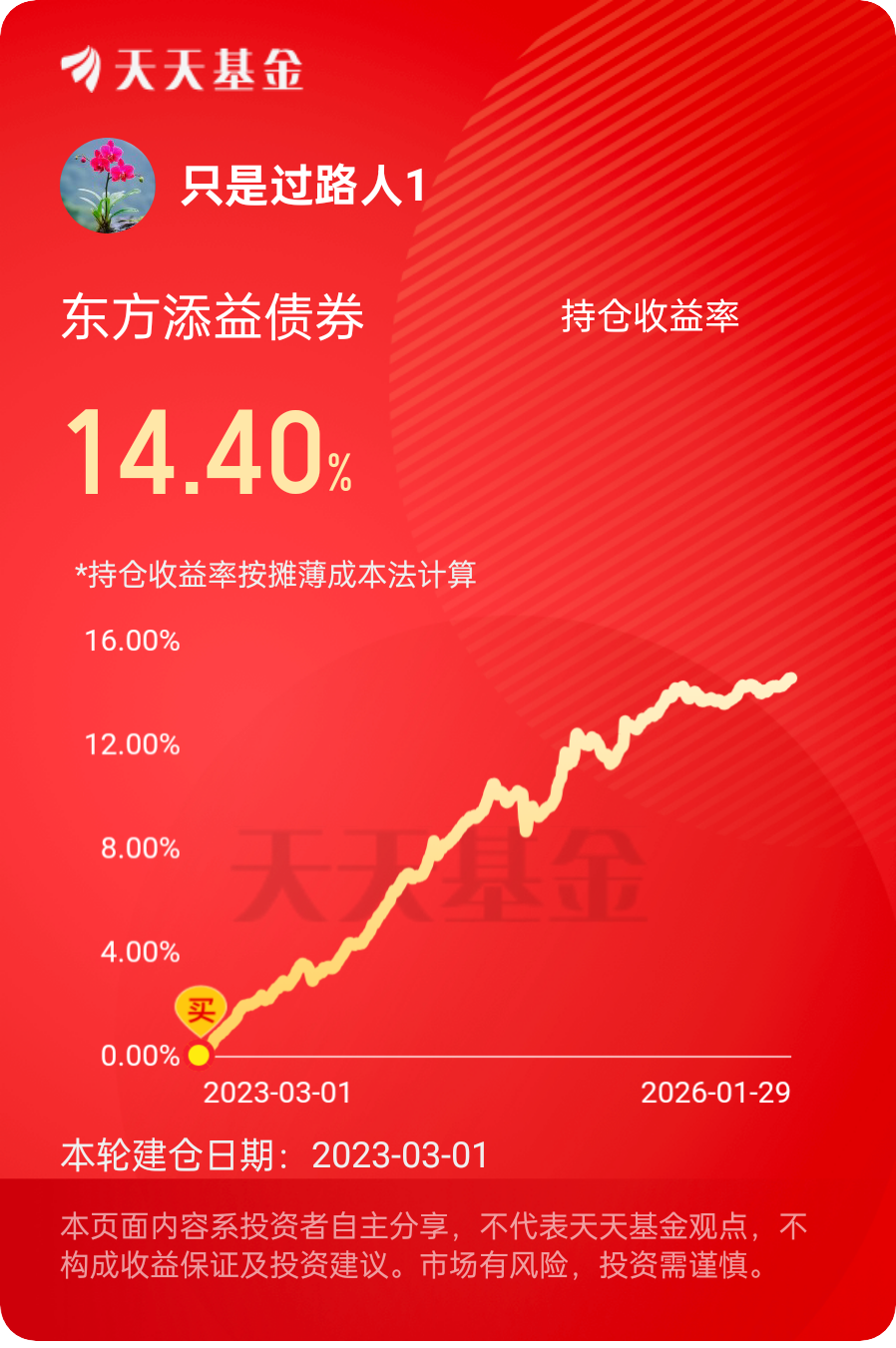 面对权益市场加剧的震荡行情,债券市场发挥出避险属性,信用债与利率债走势趋稳。依托股债搭配的持仓结构,以两类债券为核心底仓,能够有效平滑基金净值波动,守住投资组合的稳定性。$东方添益债券$ #晒收益#