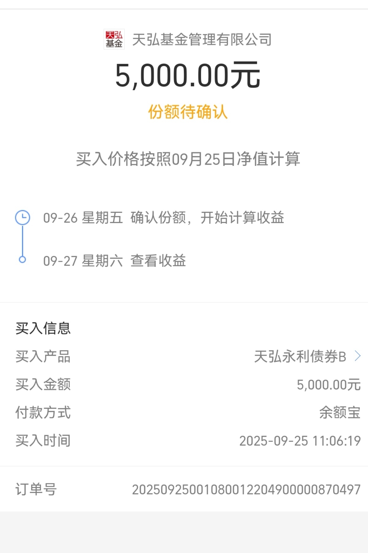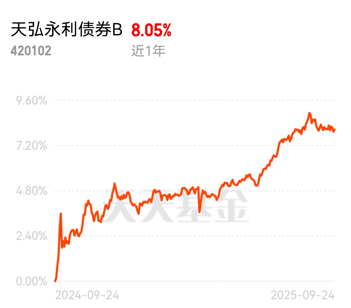 今天加5000元$天弘永利债券B$ 这只固收+兼顾灵活性与稳定性,涨时能跟上行情,跌时波动也比较小, 整体来看能涨抗跌,业绩确实还不错,近6个月涨幅3.25%,近1年涨幅8.05%,近3年涨幅超11.16%,历史年年都是正收益,同赛道排名靠前,历史盈利概率优于99%同赛道基金,持仓里面债券占比99.91%,股票占比14.41%,权益个股覆盖面也广,有军工电子、广告营销、物料、航空装备、化学制药等,赛道分布非常广,这些行业都会有周期性的机遇,波动也比较小,进可攻、退可守,而且目前的政策适度宽松,鼓励中长期资金入市,长期持有,投资性价比也挺高。