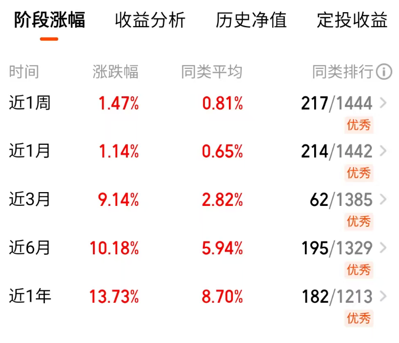 截至2025年10月29日的数据显示,$汇添富多元收益债券C$(470011)交出了一份亮眼的成绩单。该基金单位净值为1.3701,今年以来涨幅达11.06%,超越92.50%的同类产品。从中长期表现看,该基金近一年年化收益率高达13.73%,超越92%的同类产品,而近一年最大回撤不超过2%,要知道沪深300的最大回撤能超过15%。这样的业绩表现,充分体现了“固收+”产品"能攻善守"的特性。
