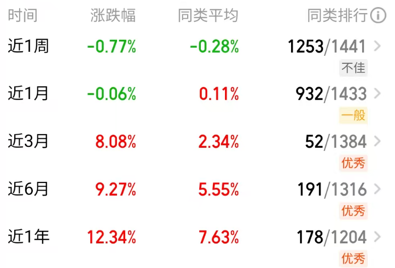 说到业绩,这只基金的表现可圈可点。截至2025年11月5日,其单位净值为1.3596元,近3月涨幅达8.08%,近1年涨幅为12.34%,近3年涨幅为14.14%。这样的业绩在同类基金中排名靠前,近3月涨幅排名52/1384,近1年涨幅排名178/1204,近3年涨幅排名208/830,业绩表现(即风险调整后收益)在同类型基金中排名前70%,可谓长期稳健的“长跑健将”。自2012年9月18日成立以来,该基金累计净值增长率已达133.44%,真正实现了资产的长期稳定增值目标。