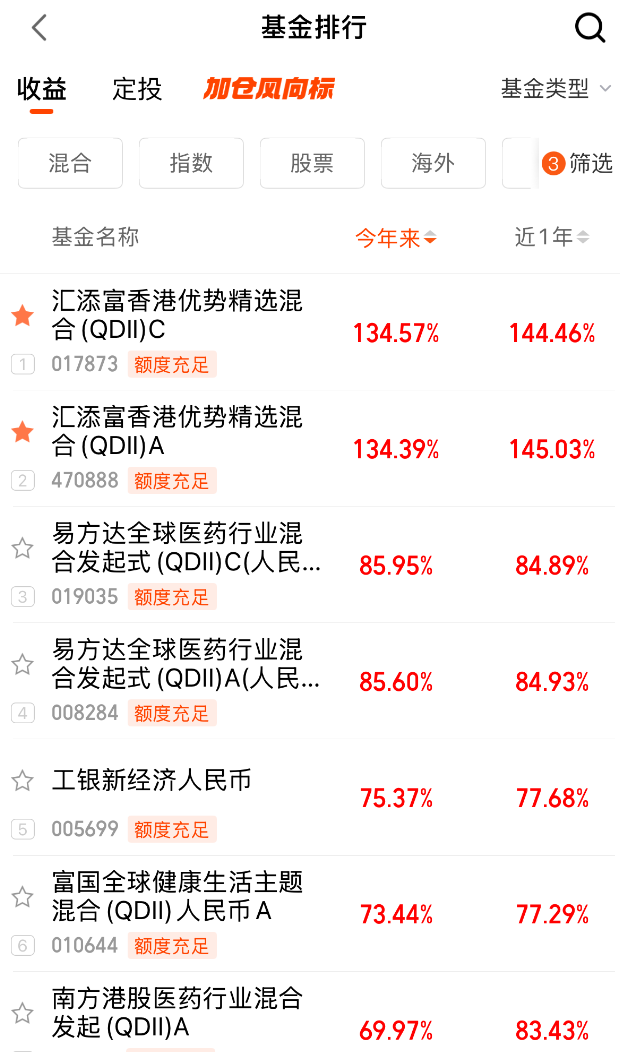兄弟姐妹们,终于开放了!$汇添富香港优势精选混合(QDII)C(OTCFUND|017873)$今天放开限购,想上车要速度了,因为基金业绩表现很强,已入选偏股基金加仓风向标,随时可能售罄关门哦!