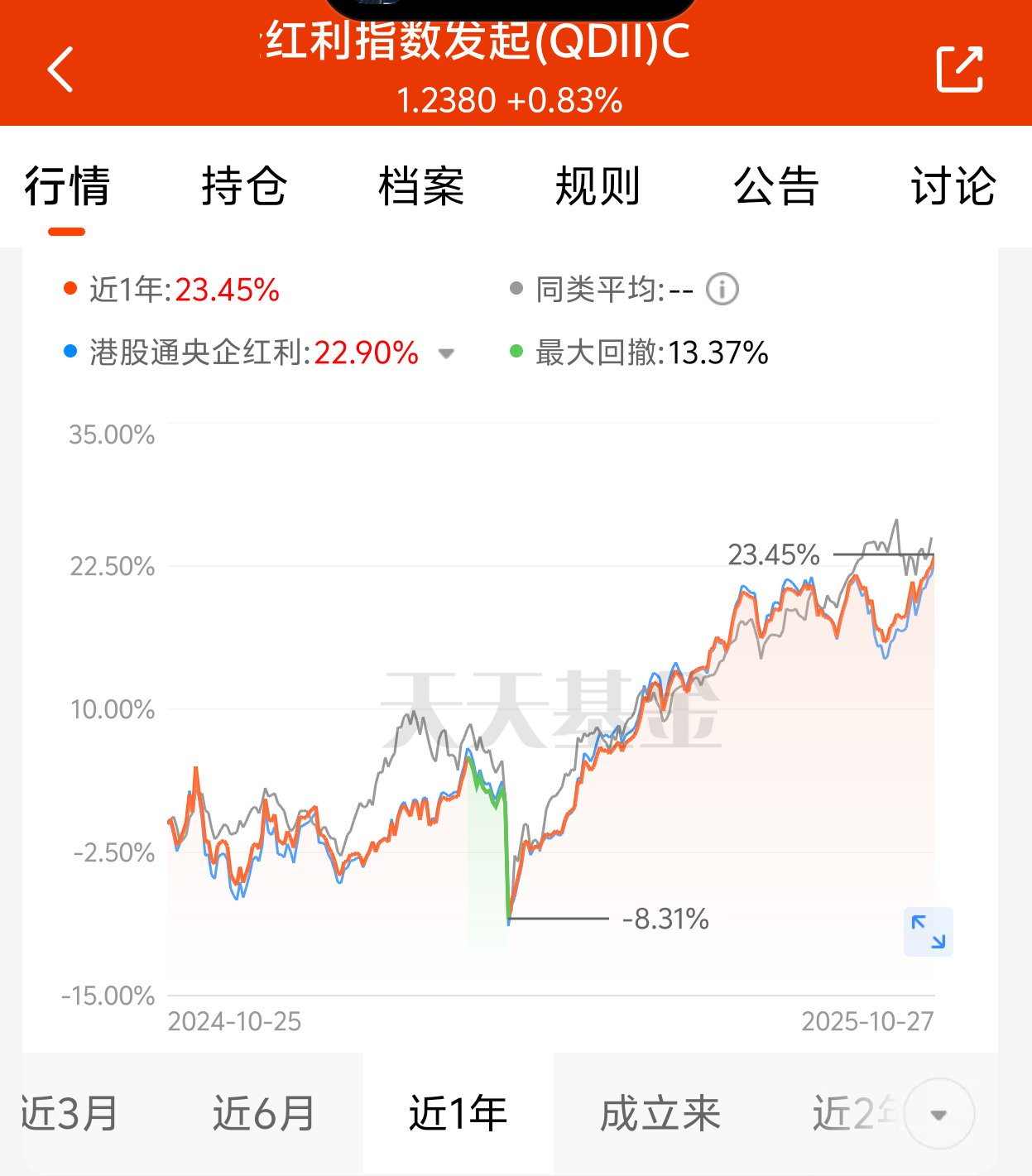今天行情还不错,三大指数,火红一片。在火爆行情的同时,我们要更加冷静。不去追高,追热点!要去赚自己认知内的钱!$中欧中证港股通央企红利指数发起(QDII)C(OTCFUND|021584)$今天中欧中证港股通央企红利,表现的也不错,今天涨幅0.83%,近一年涨幅23.45%,表现非常不错哦。其高息股低波动,使其收益稳,波动更小!