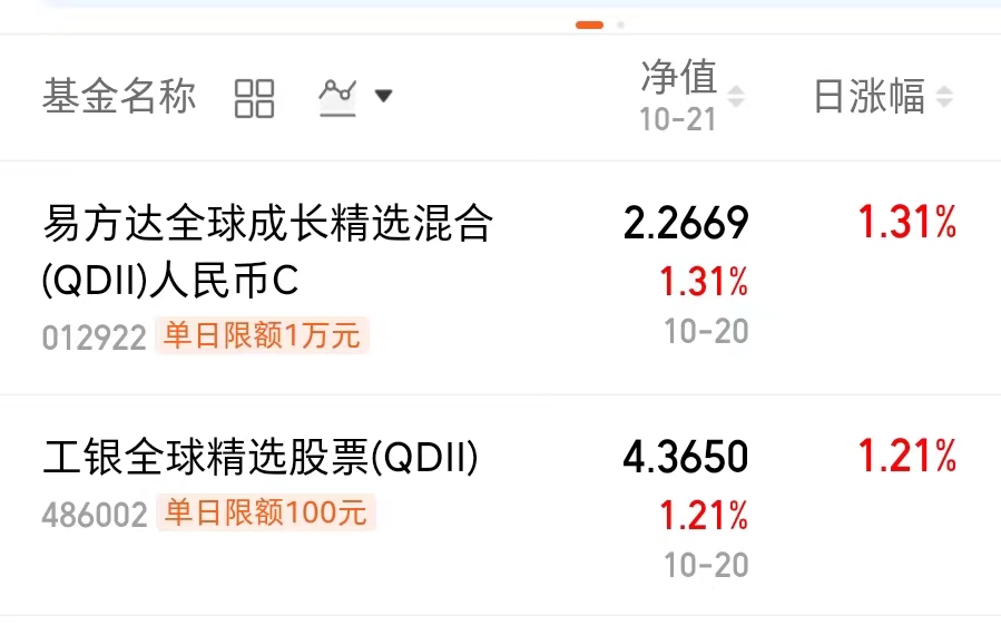 今天我们股市行情调整,也有些产品逆势上涨,业绩能力强。我发现易方达全球成长精选混合(QDII)C012922经常逆势上涨,因为他是布局全球科技的稀缺产品,基金经理眼光独到,又能做到精准及时调仓,所以业绩也比较优秀呢。