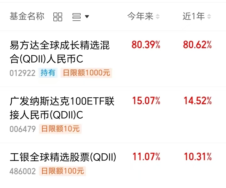 之前买的$易方达全球成长精选混合(QDII)人民币C(OTCFUND|012922)$瞄准全球科技龙头,A股、美股和港股同时分散布局。近一年上涨 80.62%跑赢相关同类,关键调整期回撤控制也出色,这个难得呀。经理前瞻性调仓既把握成长机会又控风险,目前收益也不错,打算长期持有了。
