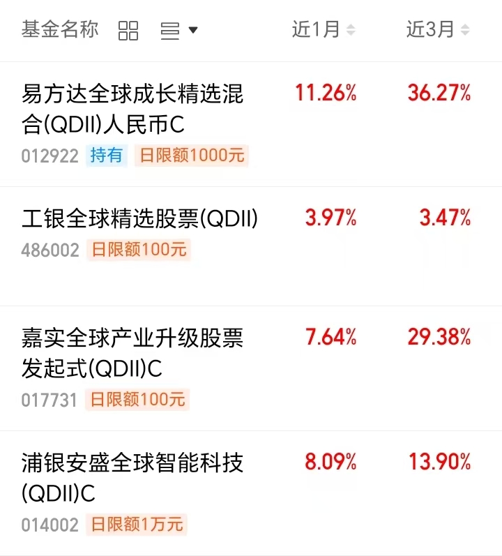 像我持有的$易方达全球成长精选混合(QDII)人民币C(OTCFUND|012922)$,瞄准全球科技龙头,A、美、港股分散配置。近一年暴涨86.3% 也是大幅跑赢同类,调整期回撤控制还出色,经理兼顾成长与风控,收益靠谱,长期持有不纠结。