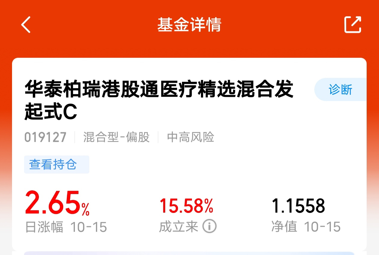 今天$华泰柏瑞港股通医疗精选混合发起式C$的估值很争气,涨超2%!看来四季度创新