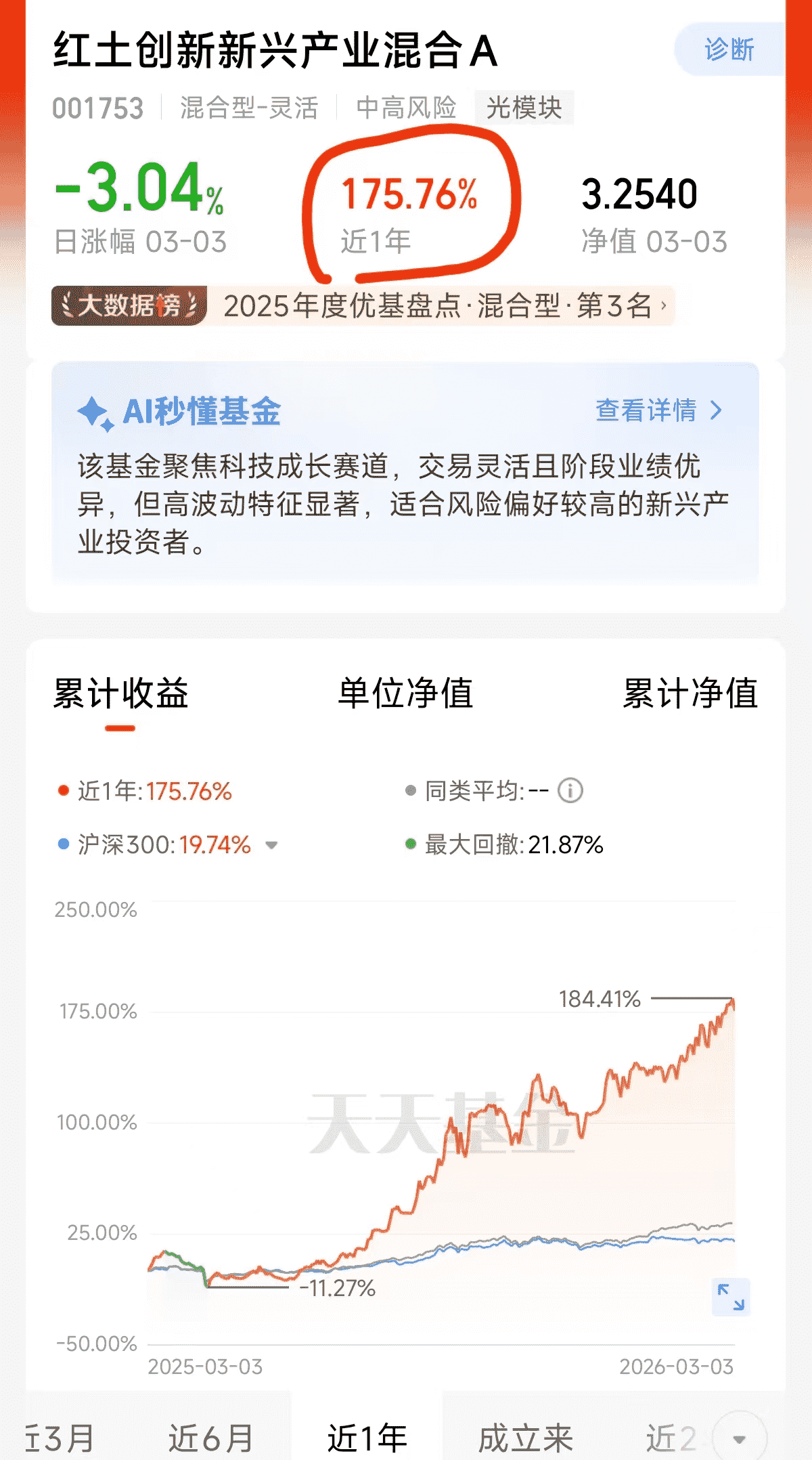 大盘这两天虽然震荡,但主线还是在光模块这边。红土创新新兴产业混合A近一年涨了175.76%不是没道理的,重仓的全是通信和电子龙头,同类中排名也一直是第一,三个月前刚出的红土创新新兴产业混合C,上车成本低,弹性更大。反正这种行情最怕手里拿的不是主流,这基的节奏感很好,一直绕着AI算力和数字经济布局,趁现在这一块回调,我再补点仓,坐等下一口肉$红土创新新兴产业混合A$