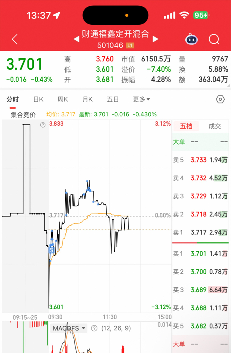 $财通福鑫定开混合(SH501046)$ 小买了点昨天进今天出,以前到现在每次都卖在高点也熟络了这个地方、 等等看看还有哪里可以买。