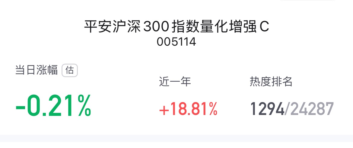 平安沪深 300 指数量化增强 C(005114)当日实时估值-0.21%,产品采用指数复制+量化增强策略,80% 以上非现金资产投向沪深 300 成分股及备选股,严控跟踪偏离度与误差。近 12个月收益率达 18.81%,长期业绩稳健