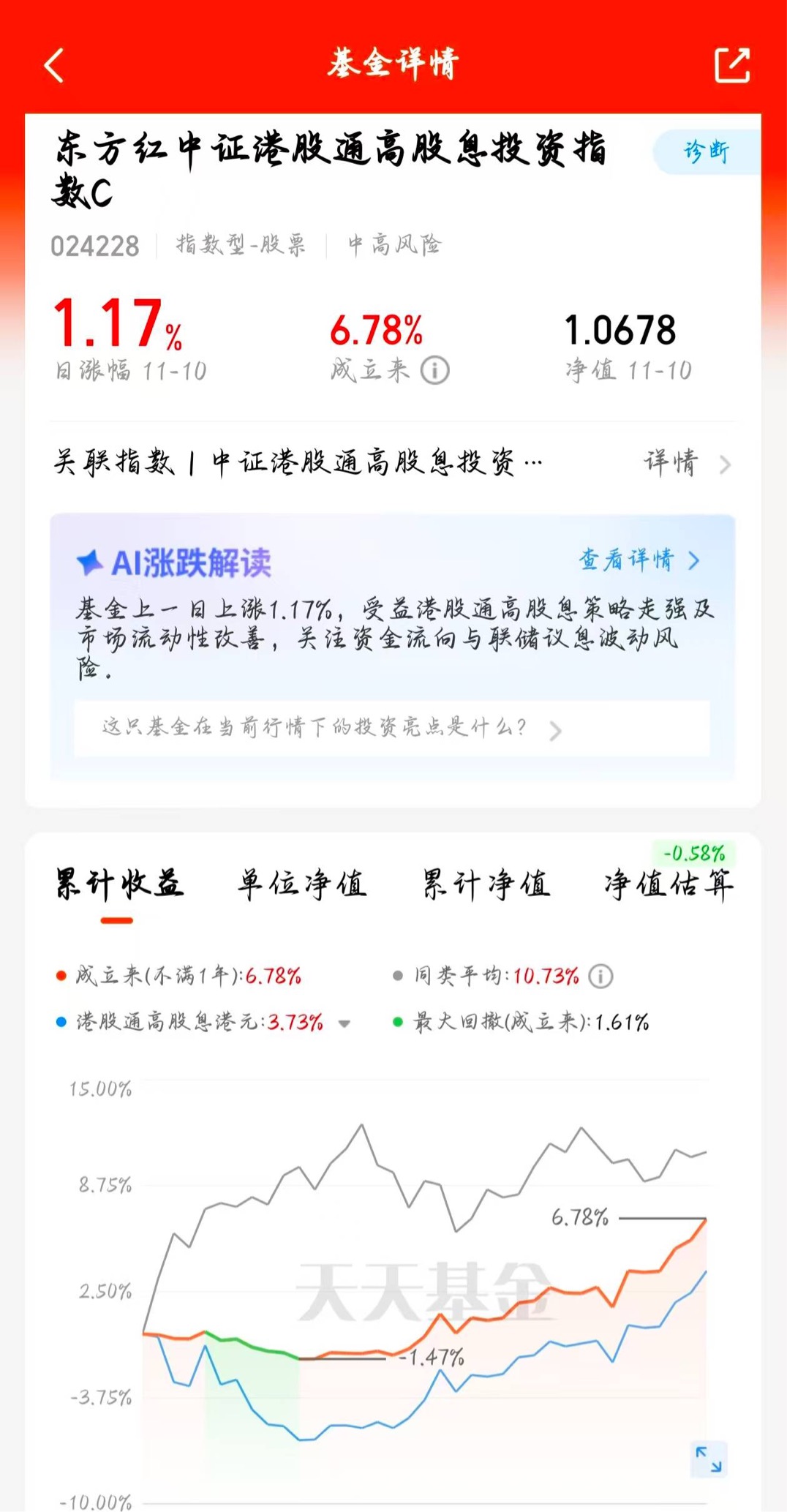 最近发现东方红港股通高股息产品真挺省心,主要投一篮子高息股波动小,上月收益接近8%回撤才1.6%,关键0费率买卖灵活,现在低位布局正合适。