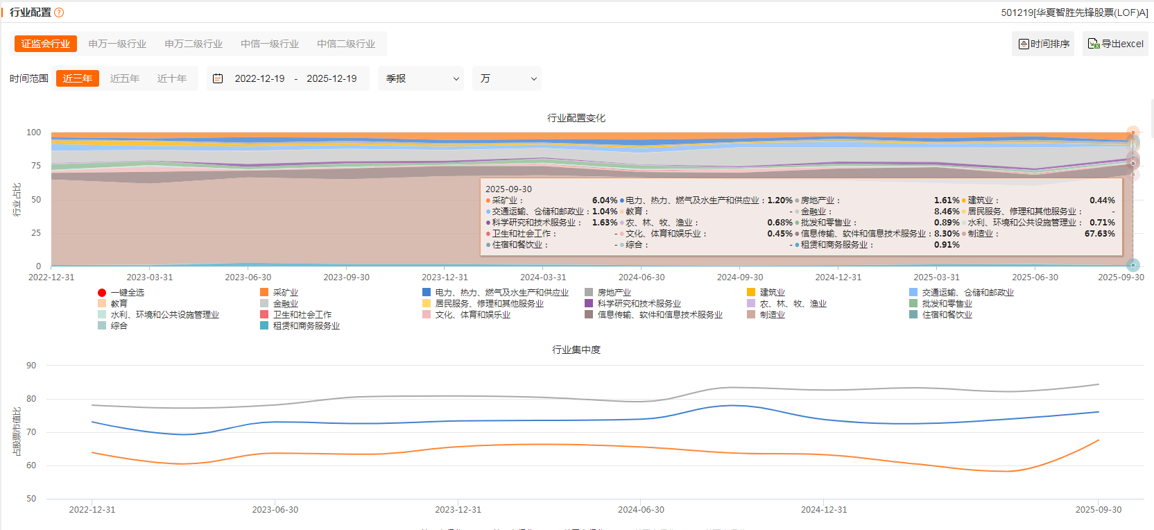 行业配置特点:基金在行业配置上采取均衡策略,覆盖了全部31个申万一级行业,但重点布局于高景气赛道。截至2025年三季度末,制造业占比63.74%,金融业占比7.97%,信息传输、软件和信息技术服务业占比7.82%,采矿业占比5.70%。这种行业配置既保持了分散性,又通过AI模型对高景气赛道的精准把握获取超额收益。