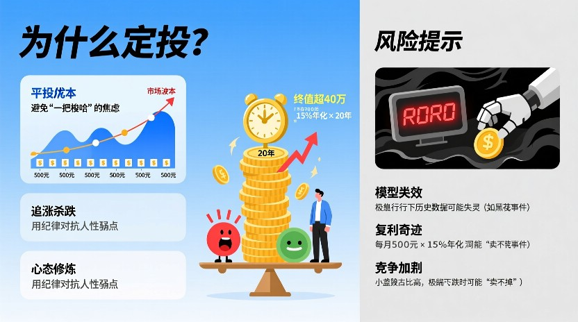 - 复利奇迹:假设年化15%,每月500元定投20年,终值超40万。