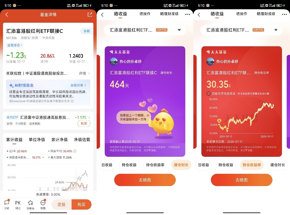 小长假终于来啦!朋友圈里全是晒旅行的,而我——作为天天基金「妳好」播客的忠实听众,完美践行着“理财不要内耗”的真谛,表面陪朋友逛吃,背地里早就打开研报刷起了外围市场动态(没错,我就是B选项应卷尽卷派!)~ 今天就掏心窝子聊聊让我安心“卷”的底气——汇添富港股红利ETF联接C(501306),从2024年7月买入、9月补仓至今,30%的收益让我这个刚毕业的职场小白,彻底认准了这只“舒服持有的长期标的”!
