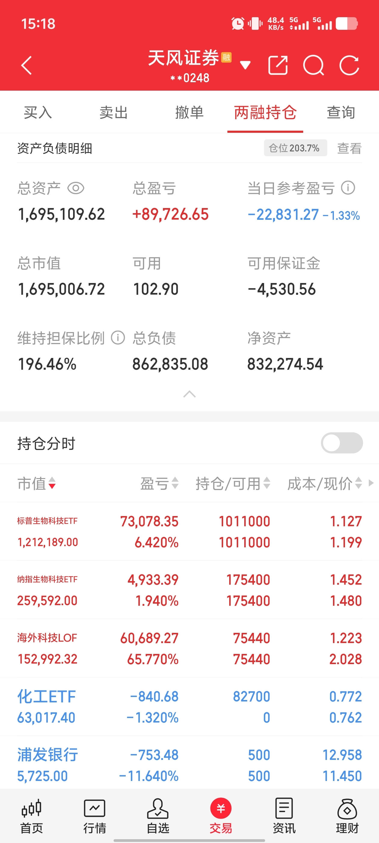 $海外科技LOF(SH501312)$ 今天又是巨亏2万5,回本遥遥无期;今天普通账户操作卖出约15万巴西ETF,买入6万多纳指生物科技,买入4万多标普生物科技,买入3万多化工ETF;信用账户卖出14万巴西ETF,卖出4万纳指生物,卖出3万多海外科技,买入15万标普生物,买入6万多化工ETF