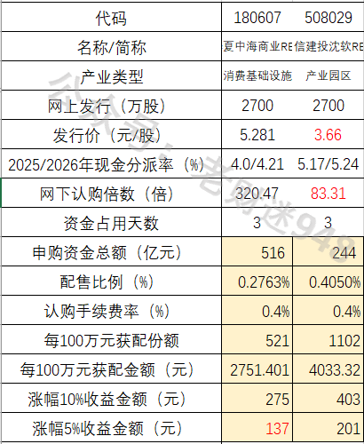 四、10月13日认购的两只REITs基金配售确认比例结果已出,华夏中海商业REIT(180607)网上认购资金总额 516亿元,配售比例0.2763%,中信建投沈软REIT(508029)网上认购资金总额244.55亿元,配售比例0.4041%。