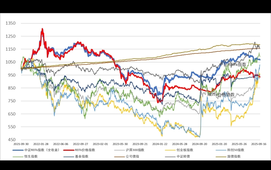 图表2 中证REITs指数、REITs价格指数及比较指数的走势图(2021.9.30—2025.9.23)