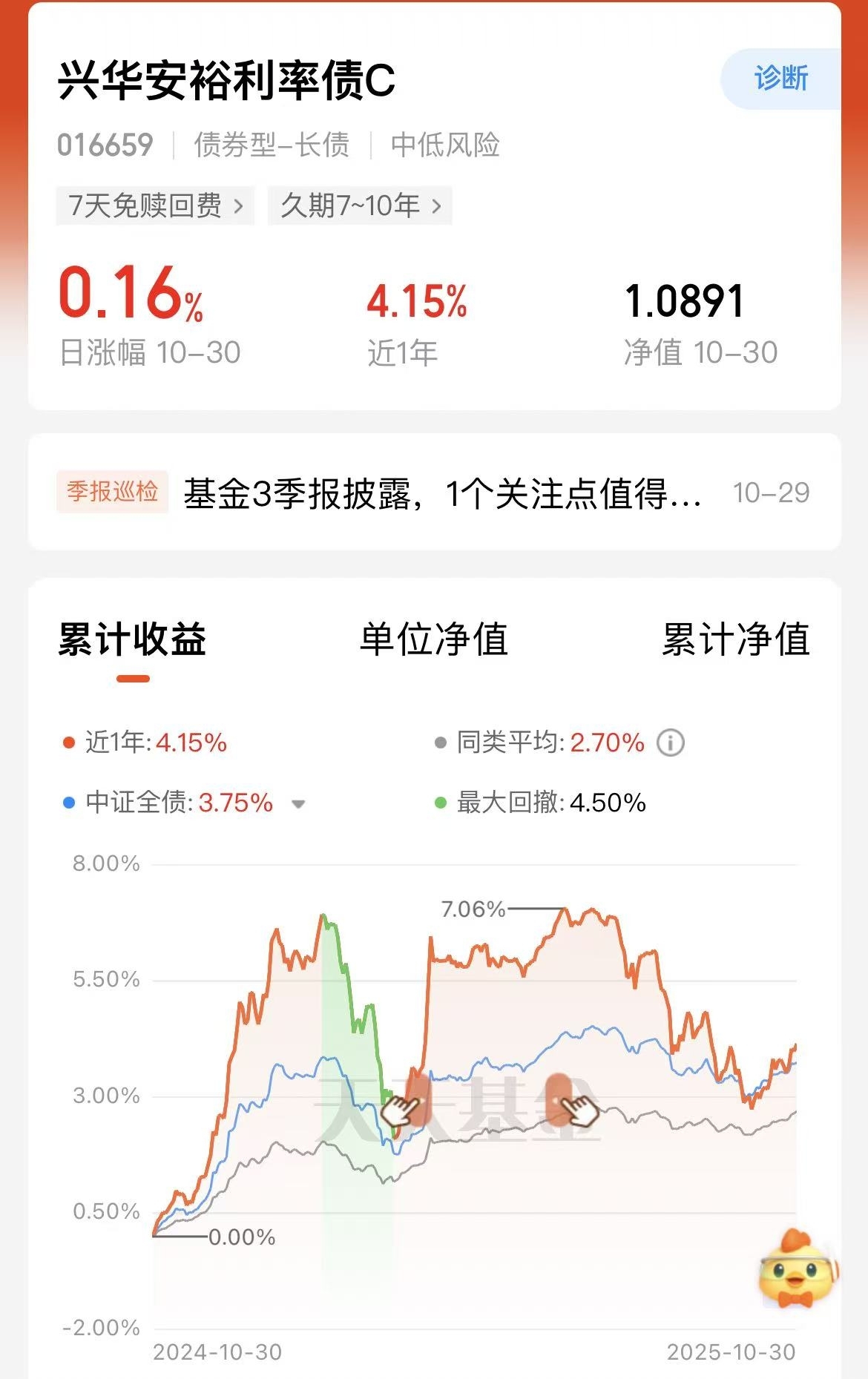 之前总觉得债基收益低,直到试了$兴华安裕利率债C$ !昨天收 16 个 “蛋”,比之前买的短债基收益翻了倍,后悔没早发现~