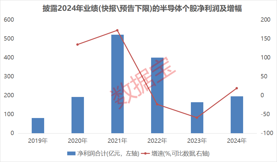 个股来看,半导体产业的业绩复苏也同样得以体现。据证券时报·数据宝统计,以披露2024年年报(含快报、业绩预告下限)的115只半导体股票为统计对象,时隔2年后,2024年整体净利润重回正增长,增幅接近20%。