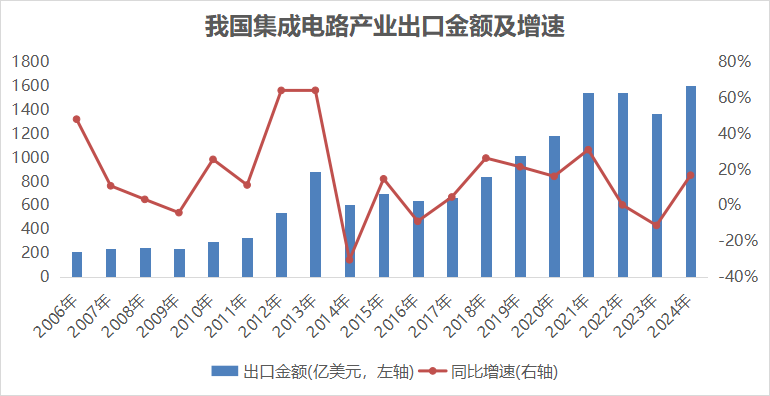 不过下降趋势在2024年得以扭转,并实现强劲回升。海关总署数据显示,2024年我国集成电路产业出口额突破历史新高,接近1600亿美元,同比增长超15%。另外,世界集成电路协会(WICA)报告显示,2024年全球半导体市场规模攀升至6351亿美元,同比增长19.8%。