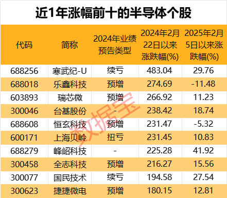 近1年涨幅前十的半导体个股,自蛇年春节以来(2025年2月5日至21日)平均涨15%;峰岹科技、寒武纪-U、国民技术涨幅位居前三,均超25%。