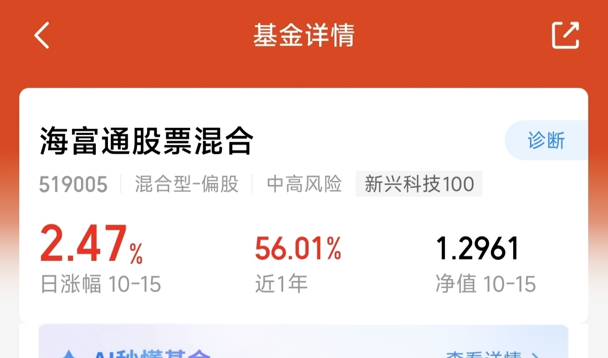 科技板块虽然这两天调整比较多,但是长期来看,目前还是继续向上的。$海富通股票混合$ 这只主动的科技混合基金。全面聚焦新兴科技。今日涨幅2.47%。修复起来的速度也是比较快。同类基金涨幅今天再次做到了领先。近一年涨幅达到了56.01%。整体表现也是涨多跌少。期待继续突破呀!