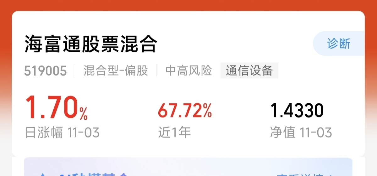 三大指数今天探底回升,集体收涨。调整的科技也是出现了企稳。不过半导体目前还是在调整。目前还是分化比较大的。 不过$海富通股票混合$ 这只主动的混合基金,今天还上涨了1.7%。不得不说,这个收益能力还是很稳的呀。近一年涨幅67.72%。同类表现,长期做到了优秀。看好四季度继续能破新高。