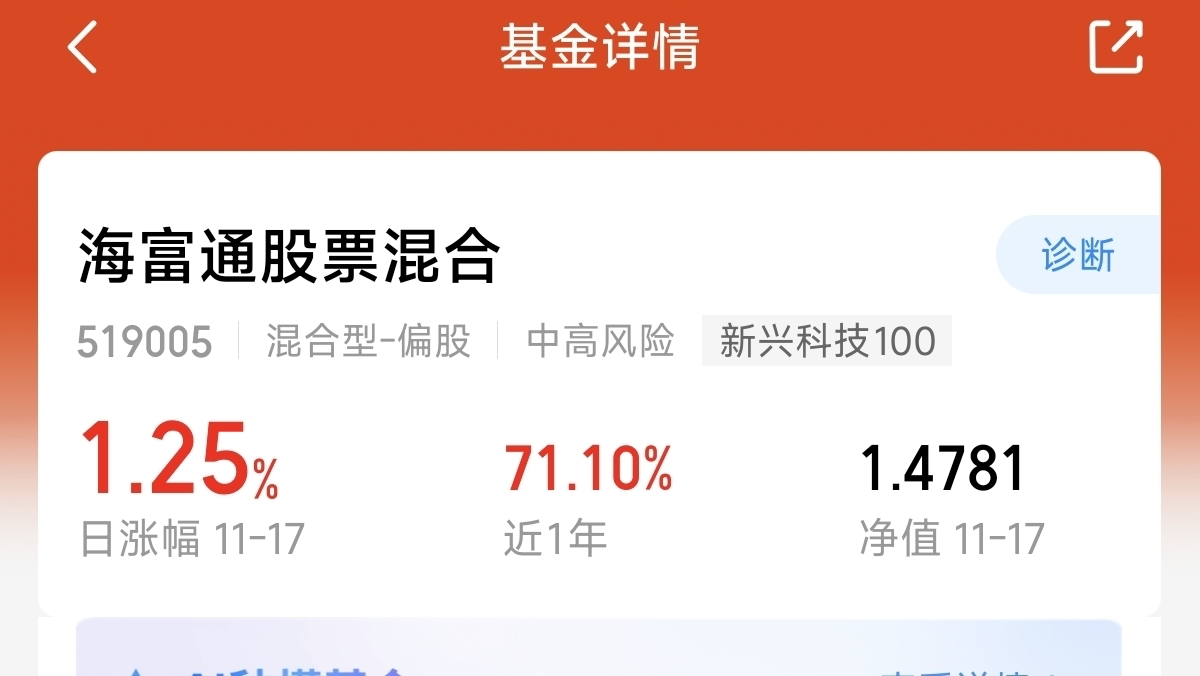 市场虽然指数是回落,但是科技的话,今天迎来了全线反弹。长期来看,科技的主线行情依然还在。$海富通股票混合$ 这只主动的科技混合积极。今天又上涨了1.25%。再次给到了惊喜。聚焦科技的表现一直不错。近一年涨幅71.1%。看好四季度继续创新高。
